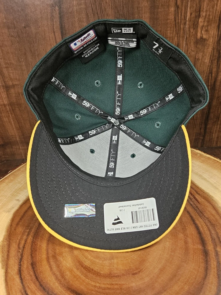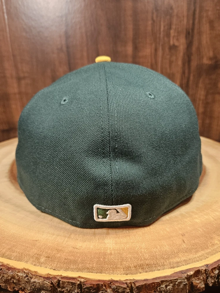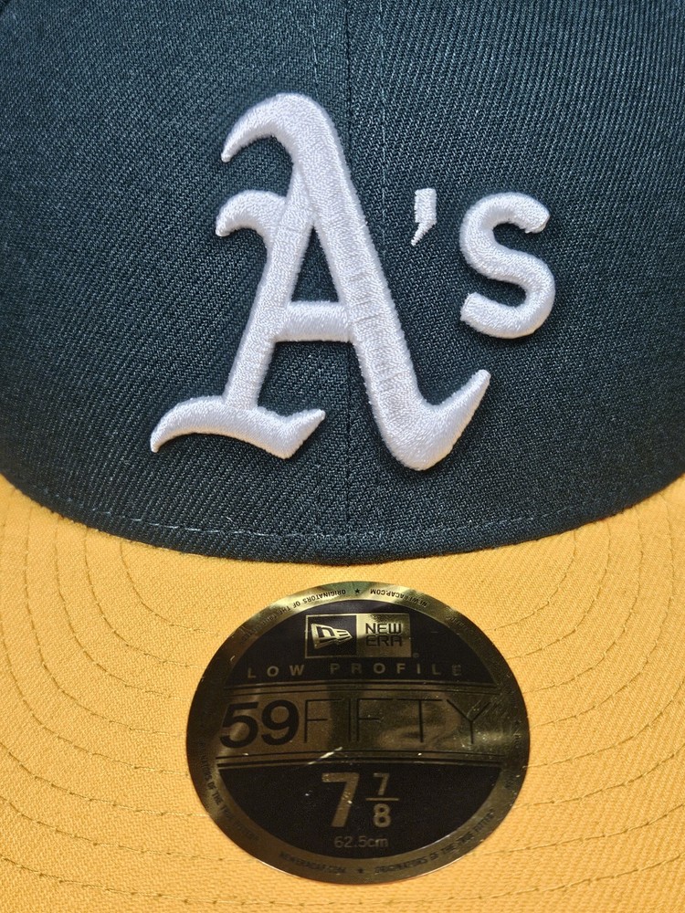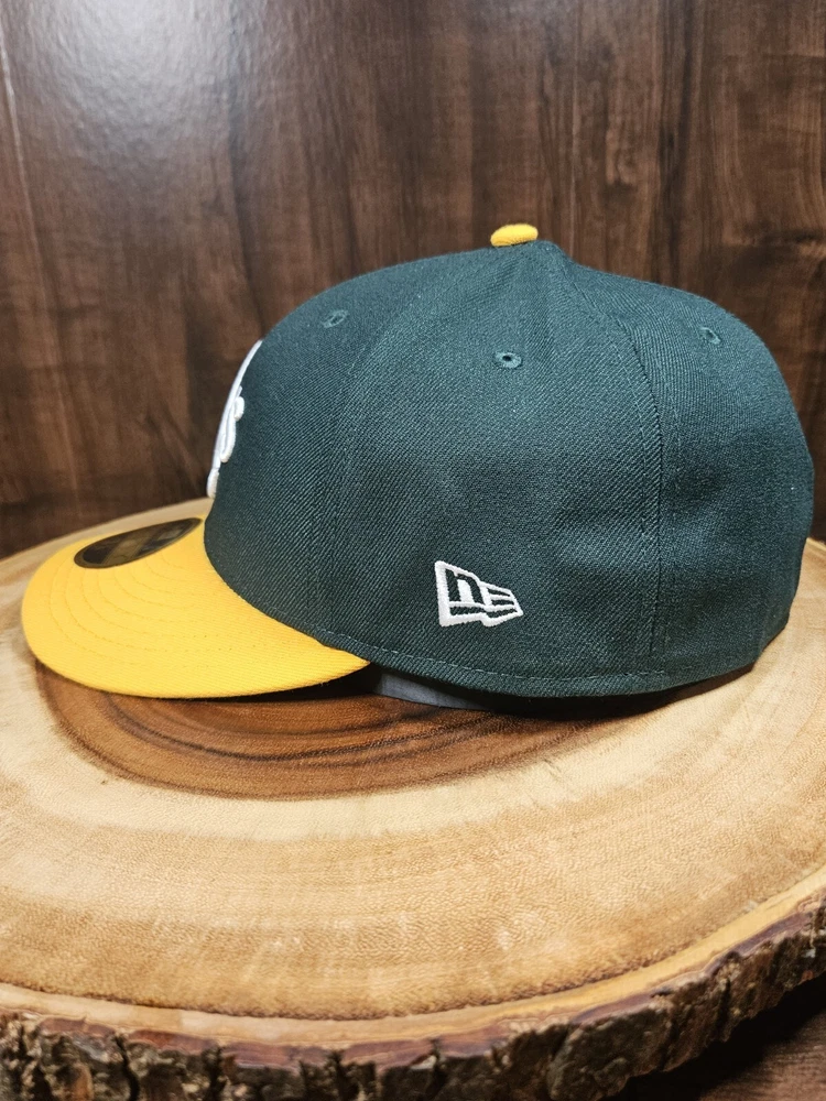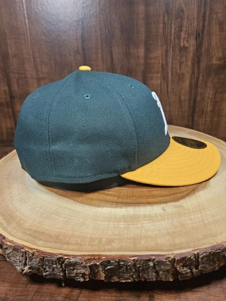 Crafted for baseball aficionados and style enthusiasts alike, the Oakland A's New Era 59Fifty Low Profile Fitted Hat Cap is a quintessential accessory for any wardrobe. Boasting a crisp green and yellow color scheme, this cap is a testament to the timeless appeal of MLB baseball and streetwear culture. The solid pattern and classic design ensure this hat will complement a variety of outfits, making it suitable for business, casual wear, or cheering on your team at the game. The hat is available in size 7 7/8, ensuring a comfortable fit for those who know their exact head size. Its fitted feature guarantees a secure and snug feel, without compromising on style. Whether you're traveling, attending a cocktail party, or simply out and about, this New Era cap is a versatile addition to your collection.