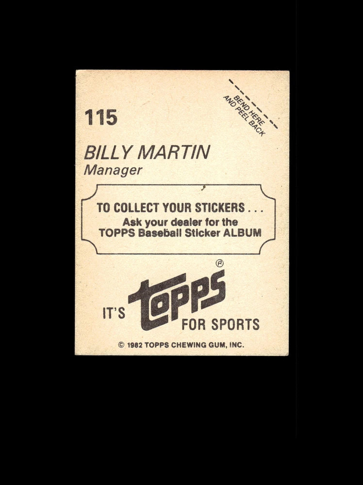 This is a nice example of a 1982 Topps Stickers #115 Billy Martin Other important information about this card: In 1982 Billy Martin played for the Oakland Athletics. Please check out our other listings for more great cards.