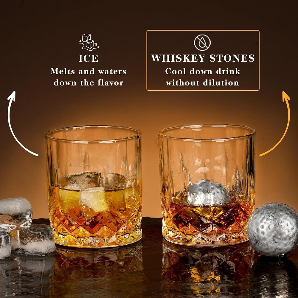【HOLIDAY GIFTS GUIDE】 【ELEVATE YOUR GIFTING WITH OUR UNIQUE GOLF-THEMED WHISKEY GIFTS】 Perfect for golf and whiskey enthusiasts, it's an ideal gift for any occasion. Enjoy sophisticated drinking with golf ball-shaped whiskey stones and a personalized 'You are tee-riffic' engraved box. Combining two beloved interests, golf and whiskey, it's a heartfelt gift choice. 【 UPGRADE YOUR VALENTINE GIFTS-GIVING WITH MAN CAVE COOL STUFF 】 Looking for a unique gift for the whiskey lover in your life? Check out our barrel-shaped whiskey stones set ! They add class to any man cave or home bar, and their unique design will make your gift set stand out. It is a perfect Christmas gifts for men. 【 COCKTAIL CARDS INCLUDED 】 In addition to enjoying the cooling whiskey stones, we also provide you with cocktail cards. These cards include a variety of classic cocktail recipes, so you can enjoy the fun of mixing your own perfect cocktail while sipping your aged whiskey 【 CHILL WHISKEY WITHOUT WATERING IT DOWN 】 Keep your whiskey pure and uncompromised without the need for ice. Say goodbye to the risk of dilution or affecting the taste with unsightly ice cubes. We have a unique solution - 304 food grade stainless steel whiskey stones. They are safe, tasteless, odorless, and will give you a better taste experience. 【 ULTIMATE ADDITION TO YOUR MAN CAVE 】: Treat yourself as you deserve. Luxury wooden boxes and crystal glasses will be a luxurious decoration and collection for your bar and man cave. Grandpa's gifts are sure to make an impression when enjoying your whiskey, bourbon, or scotch.