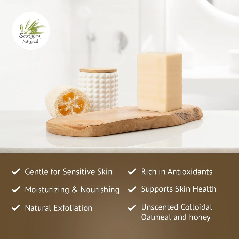 - Unscented Oatmeal & Honey Goat Milk Soap - is made with natural ingredients that your skin will love with no fragrance or scent! We’ve been making soap for over 13 years and we have many customers who tell us that they love our handmade soap. We know you'll love it too! Our soap is made with natural ingredients, using the cold process method. Our bars then cure for 6-8 weeks resulting in a harder, longer lasting bar of soap that you can feel good about using on your skin. Benefits: Our soap is great for all skin types and has helped many of our customers with dry cracked, itchy skin & sensitive skin. If you struggle with any of these skin issues give our soap a try! Key Ingredients: Olive Oil - We use a plentiful amount of olive oil in our homemade soaps, because it creates a very moisturizing bar of soap that can be soothing to dry & irritated skin. Coconut Oil - This is one of the most important oils used in natural soaps. It yields a fluffy lather and makes a harder bar of soap. Goat Milk - Real pure goat milk contains natural fats, which add to the moisturizing properties of our soap. It also has many proteins, vitamins and minerals that are good for your skin. Common uses: Use as a hand cleanser, facewash, body wash, or bathsoap. Use as a baby soap, shaving soap, face soap, hand soap, or body soap. You’ll love how well our soap cleanses your skin without leaving it tight and dry. Great for a man, woman, teen, kid and baby. Each bar weighs apprx. 4 oz Leche cabra jabón para hombres, mujer, niños, niñas, y bebe. SOOTHES TROUBLED SKIN - Give our goats milk soap a try! Many of our customers have received help with sensitive skin issues just by using our natural soap. FOR FACE AND BODY ALL IN ONE PRODUCT - You’ll love how well our goat soap cleans your skin without leaving it dry and itchy. Great moisturizing soap for men, women, kids & baby. LONG LASTING BARS THAT GIVE GREAT LATHER - Our customers tell us that our bar soap is longer lasting compared to commercial bars and other natural soaps. FRESH CLEAN FEEL WITHOUT HARMFUL INGREDIENTS - WE ONLY USE THE BEST! Olive Oil, Coconut Oil, Sustainable Palm Oil, Goat Milk, Colloidal Oatmeal and Honey. PERFECT GIFT SET FOR ANY OCCASION - Christmas, Valentine's Day, Mother's Day, Father's Day, Birthday, Teacher's Gift, House Warming Gift