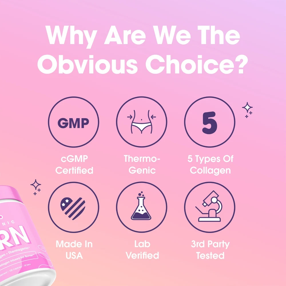 Product details The first of its kind, Obvi's Collagenic Burn Collagen Infused Thermogenic Burner combines collagen's beauty benefits with a way to help you lose weight, so you can look and feel your best inside and out. Our collagen peptide capsules are an easy way to get in your collagen for the day, feel a boost in your mood and energy, and help improve your metabolism for weight loss. This formula contains two patented ingredients, five natural weight loss-enhancing ingredients, and five types of collagen and biotin for healthier hair, skin, nails, joints, bones, and gut. Easy to take each day, Obvi's Collagenic Burn is perfect for a variety of lifestyles, especially busy ones! Unisex. 30 servings. Collagen peptide protein infused thermogenic burner capsules for beauty and weight loss The World's First Collagen Infused Fat Burner Helps with weight loss, boosting metabolism to burn calories, curbing appetite, boosting energy and mood, and developing healthier skin, hair, nails, joints, and gut Contains two patented Innobio and BioPerine ingredients Five natural weight loss enhancing ingredients include green tea extract, cayenne pepper, caffeine, raspberry ketone, and garcinia extract Has five types of collagen as well as biotin Perfect for busy lifestyles and those who can't make it to the gym Take four capsules per day, two in the morning and two in the afternoon