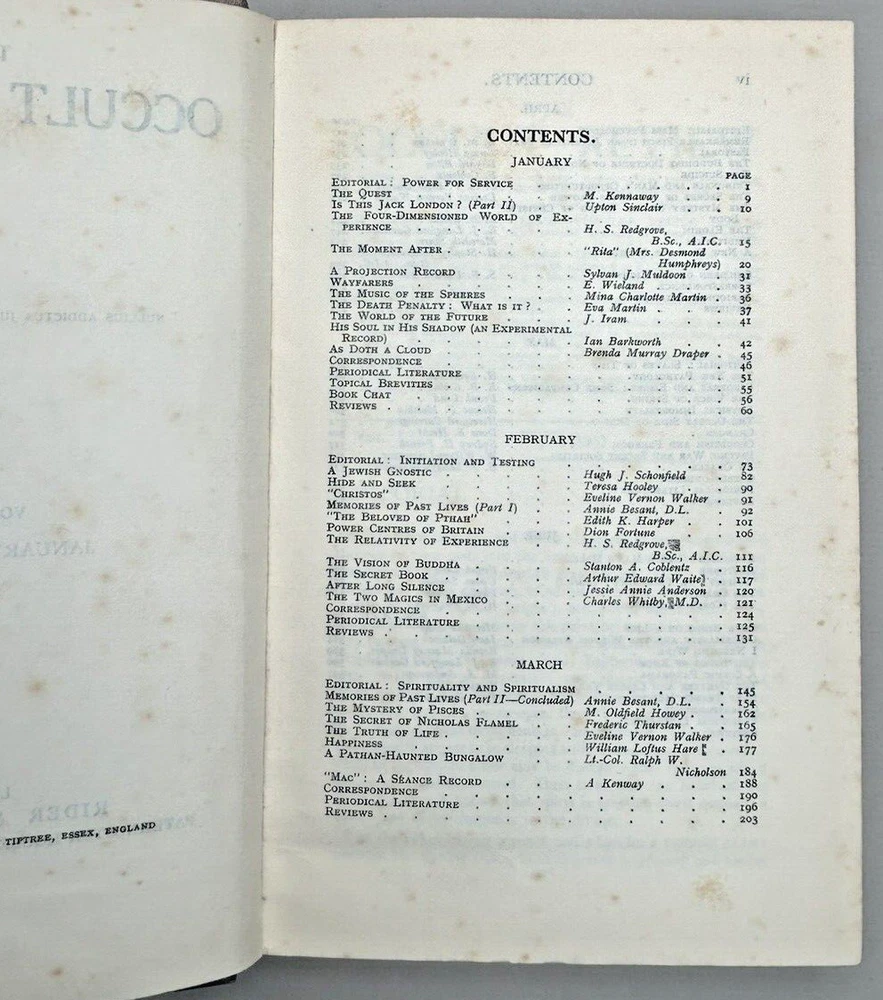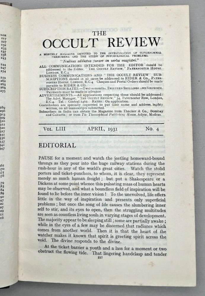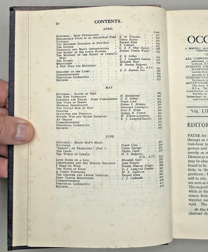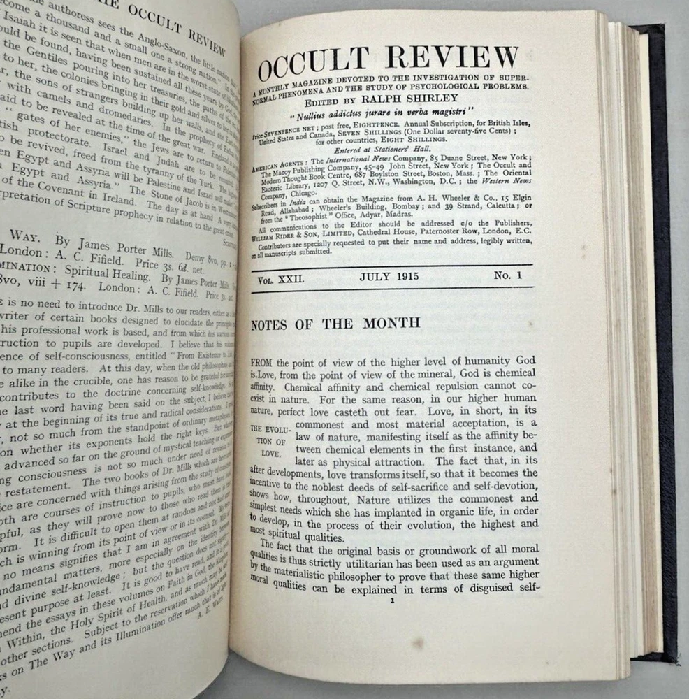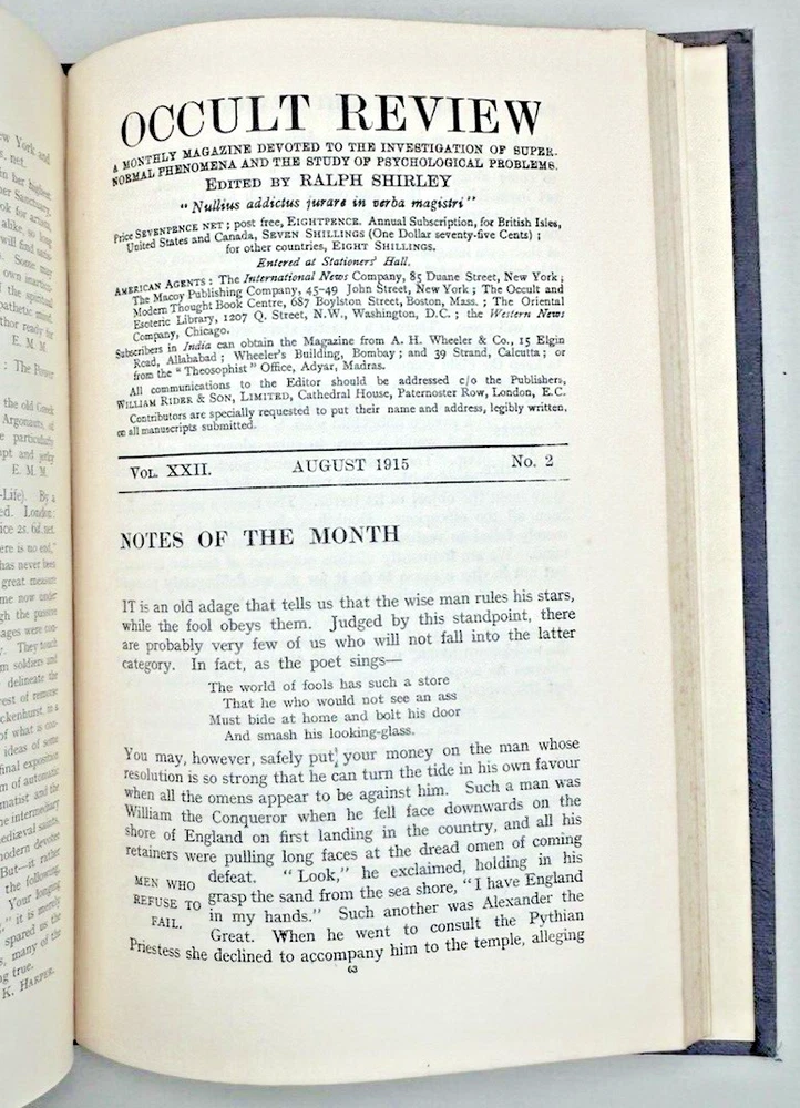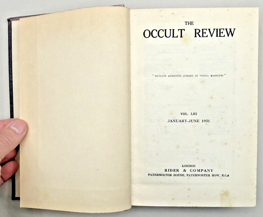 Bound edition of The Occult Review Magazine. Cover page states VOL. LIII January-June 1931, however the actual contents are April, May, June 1931 and June, July, August 1915. Note: This book will be properly packed.