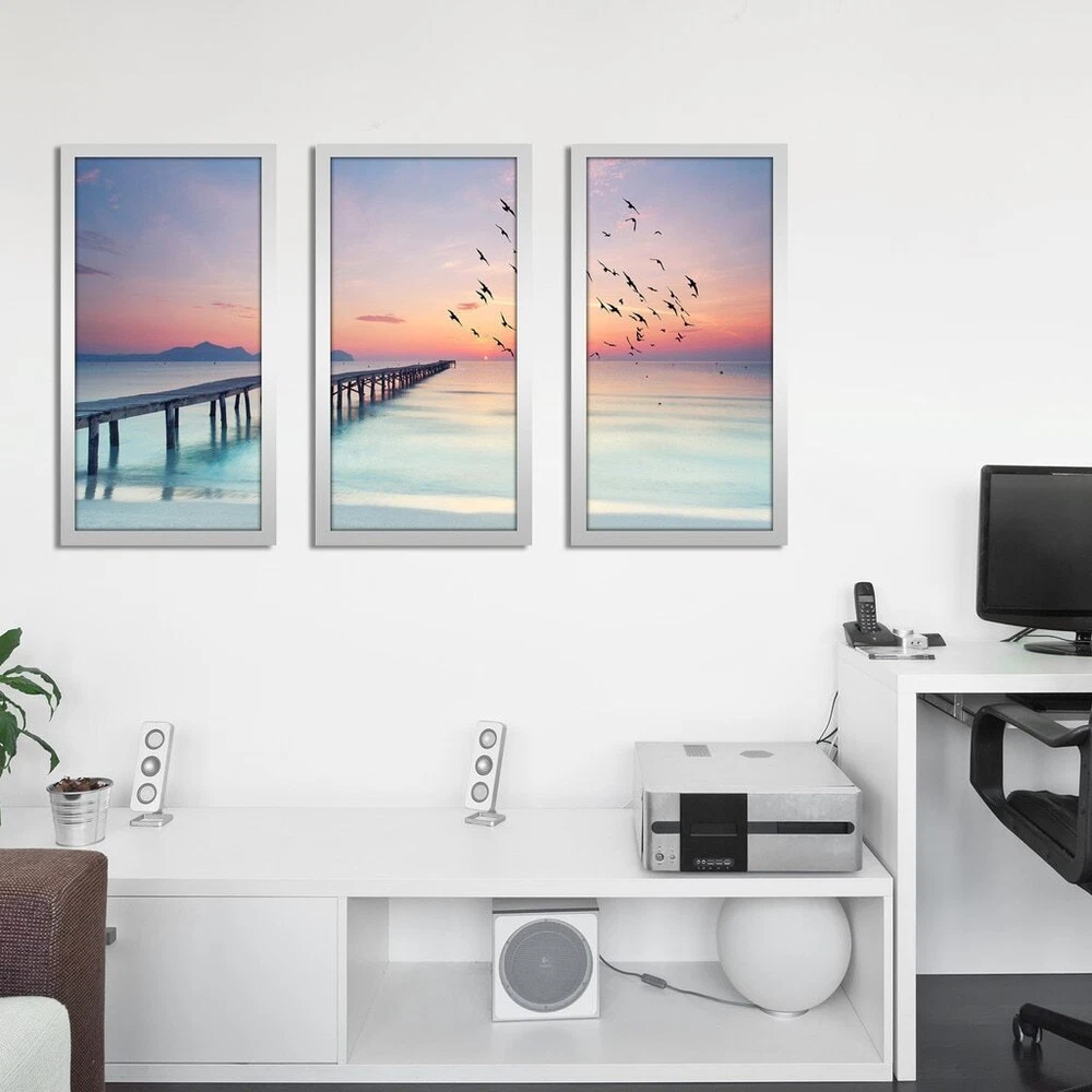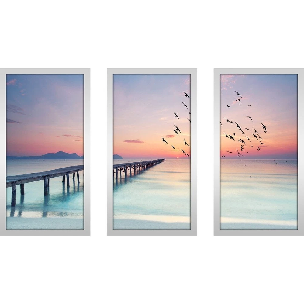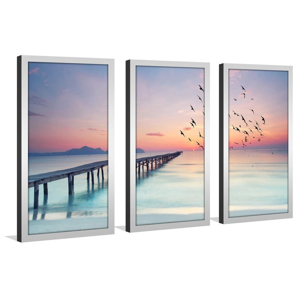 This Wall Art Set of 3 is printed on Plexiglass using a high-speed flatbed printerProducing excellent print quality with a 6-color plus white UV-curable inkjet systemThe breathtaking effect of fine art printed directly onto Acrylic is unique and exquisiteIts reflective vibrant colors creates a contemporary style of art that will bring depth to your wallsThe artwork has been reprinted from the Artists' original piece with written permissionMade in North America & Arrives ready-to-hangFrame: 1" SilverThis framed art print is being custom built for you. Please allow 10 business days for the product to leave our warehouse. Shape: RectangleOrientation: HorizontalSubject: Sea & Shore, PhotographyStyle: Fine Art Giclee Free Shipping Over $49.99* Details "Ocean Skies 2" Framed Plexiglass Wall Art Set of 3 Product Description: This Wall Art Set of 3 is printed on Plexiglass using a high-speed flatbed printerProducing excellent print quality with a 6-color plus white UV-curable inkjet systemThe breathtaking effect of fine art printed directly onto Acrylic is unique and exquisiteIts reflective vibrant colors creates a contemporary style of art that will bring depth to your wallsThe artwork has been reprinted from the Artists' original piece with written permissionMade in North America & Arrives ready-to-hangFrame1" SilverThis framed art print is being custom built for you. Please allow 10 business days for the product to leave our warehouse. ShapeRectangle OrientationHorizontal SubjectSea & Shore, Photography StyleFine Art Giclee