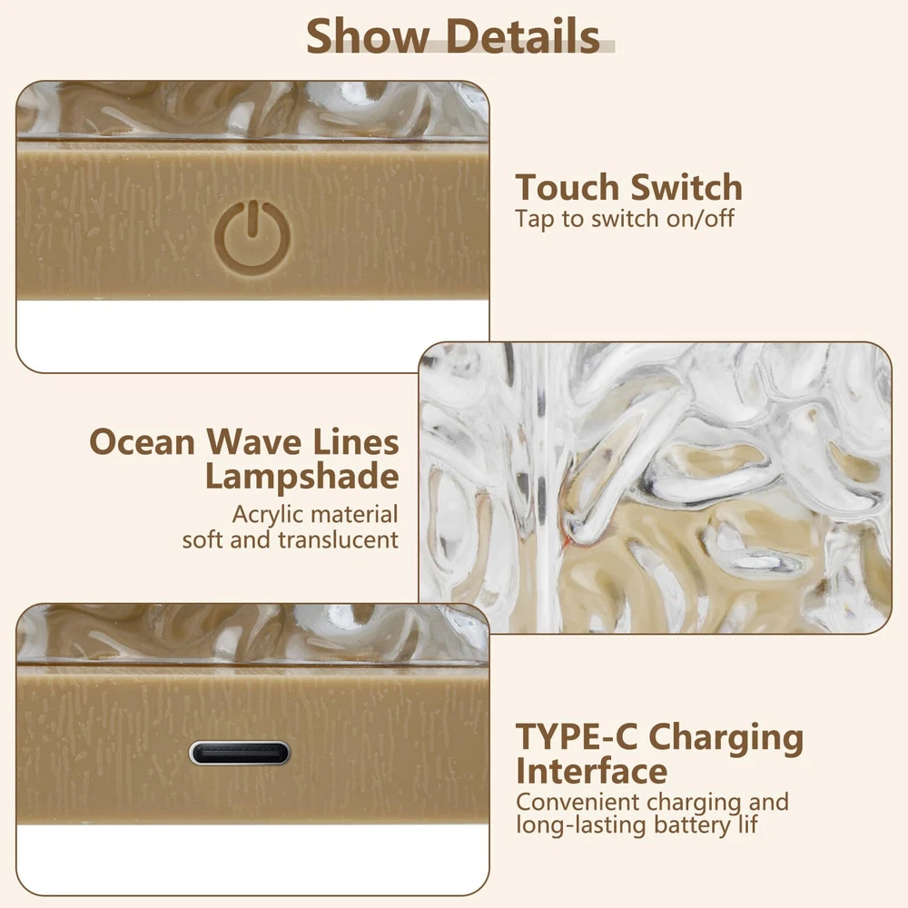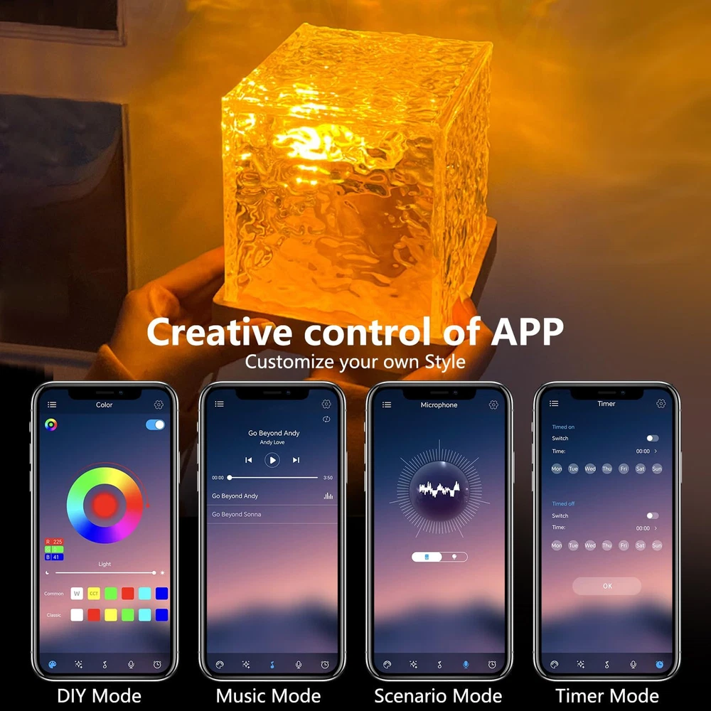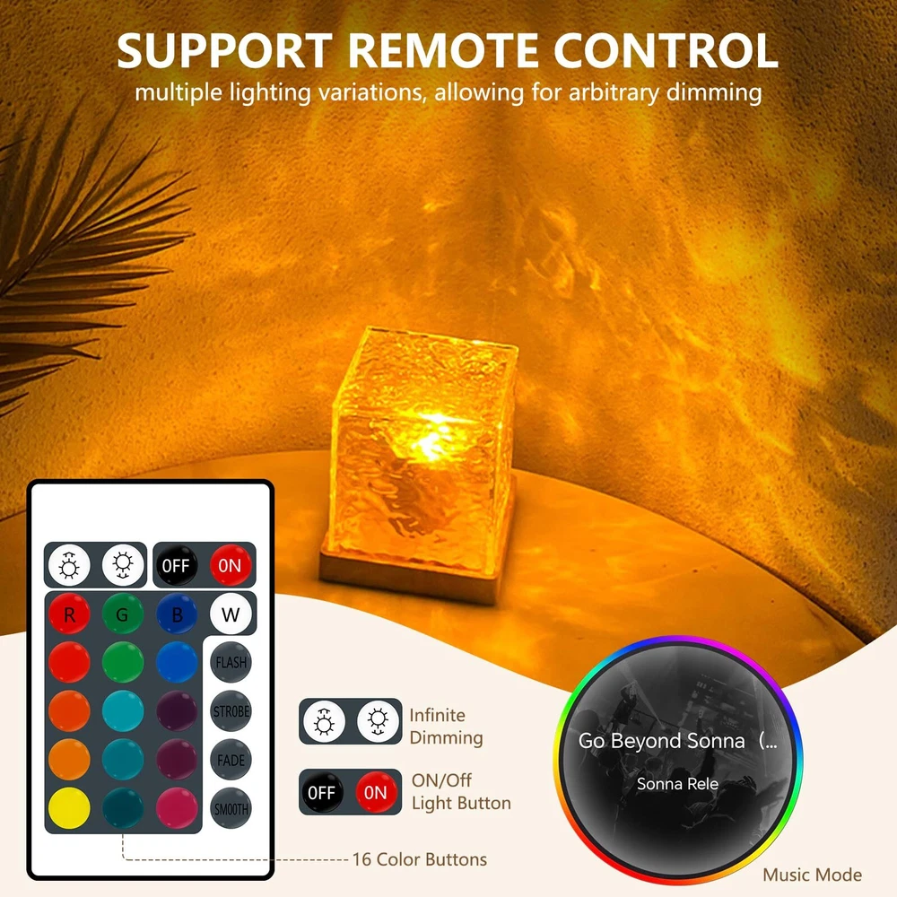 【APP & Remote Control】- The ocean wave lights projector can be controlled via the APP or remote control. Scan the QR code on the instruction manual to download the APP and you can easily use your phone to control ocean wave lamp. Customize the gradient mode, select from 16 light colors, and set timers according to your preferences. Tips: Unable to connect to APP when the ocean lamp is low on power! 【16 Colors & Adjustable Modes】- ’s unique ocean wave light feature showcases 16 different light colors, 10 adjustable brightness levels, and 4 dynamic modes. This ocean night light is perfect for decorating your bed room, enhancing photos, and creating diverse atmospheres. 【Rechargeable & Portable】- This ocean lights projector is rechargeable with a built-in battery. Touch-sensitive switch for easy on/off. Equipped with a TYPE-C charging port, aurora projector light includes a complimentary TYPE-C charging cable for recharging. Long-lasting power makes it the perfect ocean light for your home. 【Stylish Design & Magical Ambiance】- Featuring an acrylic water ripple lamp shade, this northern lights creates a dreamy and dynamic ocean wave effect, softly diffusing light. Ideal for creating a calming atmosphere in your home, it’s great for relaxing evenings and can even help soothe children to sleep. 【Perfect Gift Choice】- This water projector light is an ideal gift for Valentine's Day, Christmas, birthdays, and anniversaries. Its soothing ocean wave effects make it a wonderful addition to any bedroom, creating a tranquil night environment that helps calm both adults and children, making it a perfect choice for creating a peaceful ambiance.