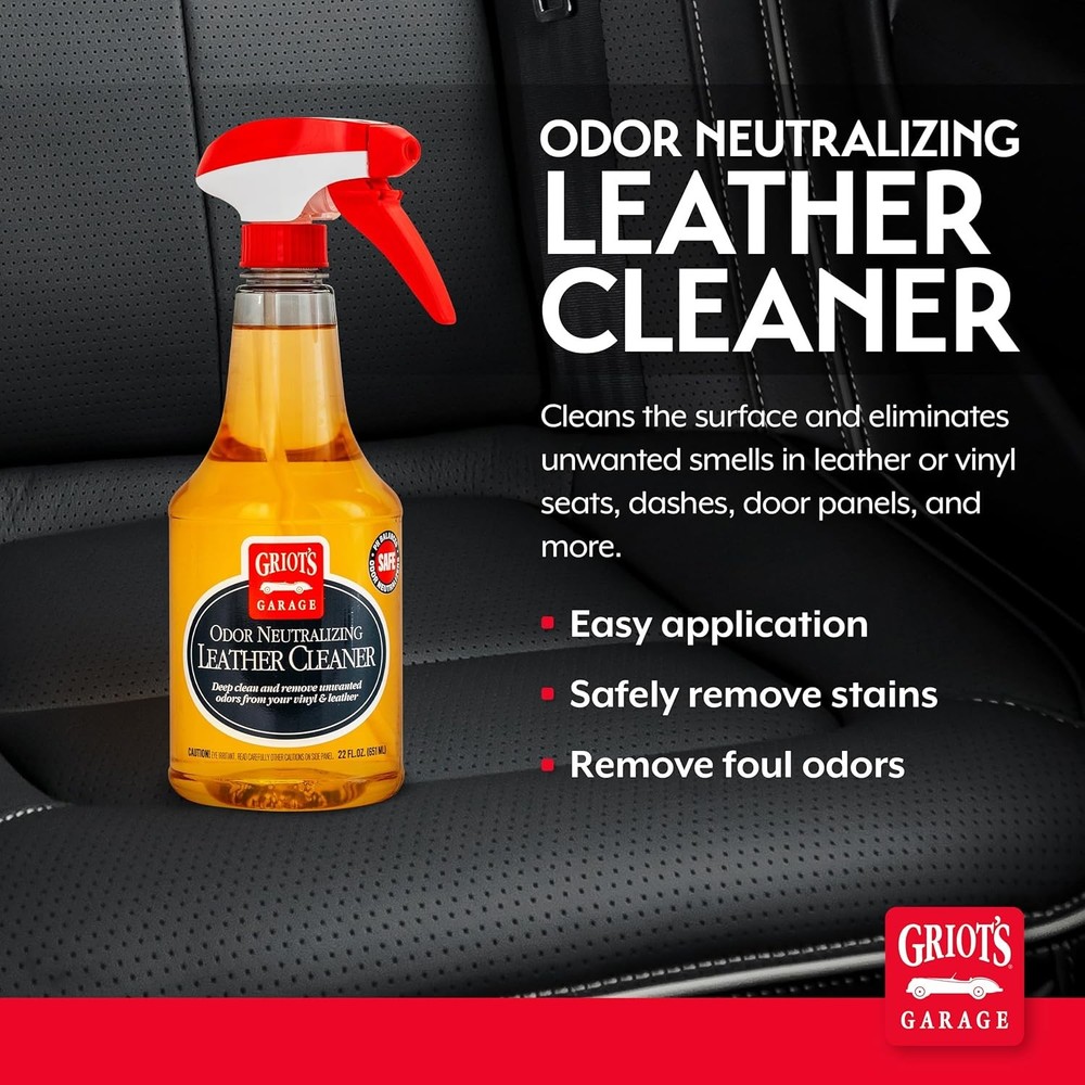 Odor Neutralizing Leather Cleaner for Car Seats, Dashboard, Door Panels, Eliminates Unwanted Smells, 10971, 22oz DEEP CLEAN AND ODOR REMOVAL: This powerful car leather cleaner penetrates deep into the grain to lift dirt, stains, and unwanted smells, restoring your leather or vinyl to a fresh, clean, and like-new condition. SAFE AND EFFECTIVE: The pH-balanced formula of this auto leather cleaner is tough on stains but gentle enough for use on aniline and pigmented leather; Made in the USA. ELIMINATES TOUGH ODORS: Unlike other cleaners that just mask smells, our leather odor remover neutralizes unpleasant odors at the source for long-lasting freshness. VERSATILE FOR ALL SURFACES: Ideal for leather and vinyl seats, dashes, door panels, and more, this genuine leather cleaner lifts dirt and grime while restoring the natural look of your car interior with a clean and refreshed finish. EASY-TO-USE LEATHER INTERIOR CAR CLEANER: Simply spray and wipe to quickly lift dirt, grime, and stains from leather and vinyl surfaces.