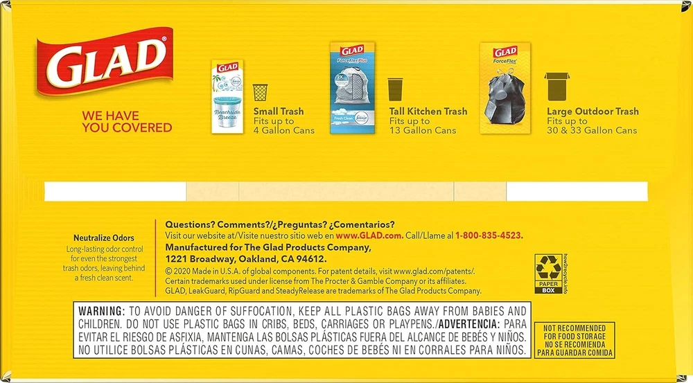 Odorshield 13 Gallon Tall Kitchen Trash Bags with Febreze, 110 Count FORCEFLEX STRENGTH: Experience the reliability of Glad’s innovative ForceFlex technology, engineered to stretch and expand around heavy loads and sharp edges, ensuring maximum durability and strength; packaging may vary GAIN FRESH CLEAN SCENT: Transform your kitchen or household environment with the delightful and refreshing scent of Gain Fresh Clean, complemented by Febreze Freshness for an inviting atmosphere 2 LAYERS EXTRA LEAK PROTECTION: Designed with two robust layers, these kitchen trash bags effectively trap liquids and prevent leaks, making them strong enough to handle even the heaviest loads without worry ODOR PROTECTION: Keep your kitchen smelling fresh with OdorShield technology that traps, locks, and neutralizes unpleasant kitchen odors, providing lasting freshness for your home GRIPS THE CAN DRAWSTRING: Featuring a durable 3-ply drawstring design, these bags grip the trash can securely, ensuring they stay in place while making it easy to close and carry out the trash without fear of leaks or tears Embrace the power of Glad ForceFlex to tackle all the messes that everyday life throws your way. The Glad Tall Kitchen Drawstring Trash Bags are expertly crafted with ForceFlex technology, allowing them to flex and expand around sharp edges and heavy loads, ensuring you can pack them full without the risk of tears, rips, or punctures. Equipped with RipGuard and LeakGuard technology, these trash bags provide extra leak protection, preventing any messy seepage of liquids and keeping your trash securely contained. Banish unpleasant kitchen odors with the potent combination of Febreze freshness and the irresistible Gain Fresh Clean scent, which works tirelessly to trap, lock, and neutralize odors, leaving your kitchen smelling clean and inviting. The Grips The Can Drawstring ensures a snug fit on your trash can, allowing you to confidently transport your trash to the curb without any leaks or tears. Say goodbye to trash bag frustrations and hello to a cleaner, fresher kitchen with Glad! FEBREZE and GAIN are used under license from The Procter & Gamble Company or its affiliates. Thank you for viewing our Odorshield 13 Gallon Tall Kitchen Trash Bags with Febreze, 110 Count.