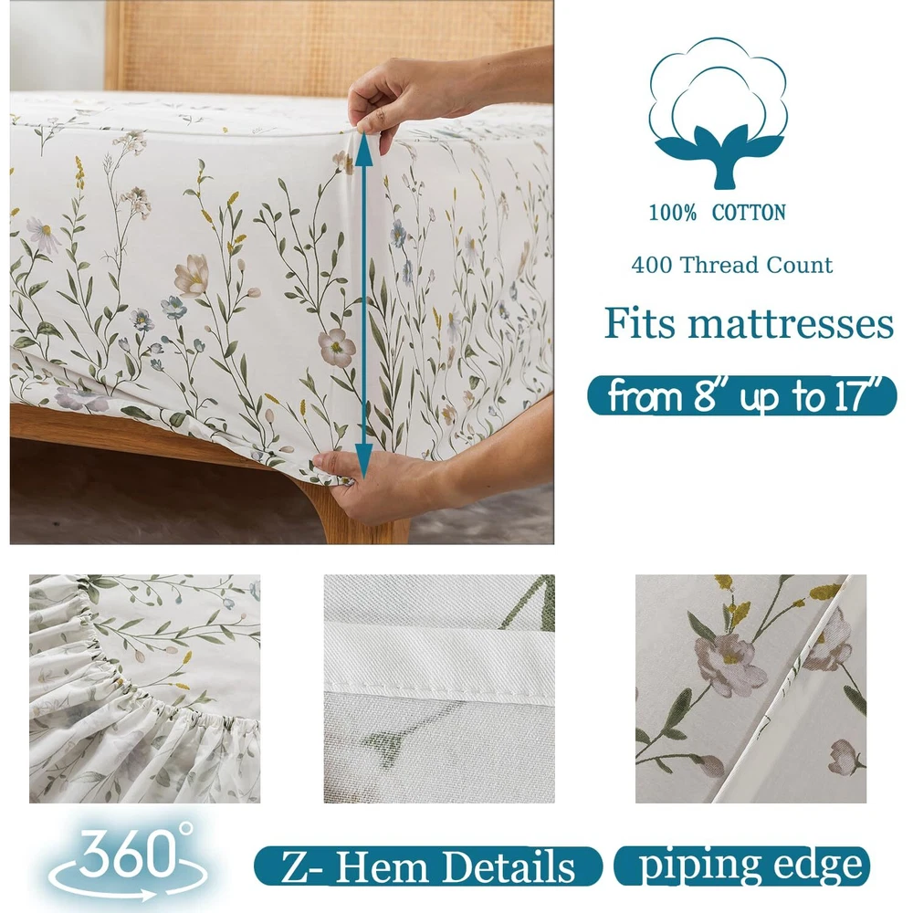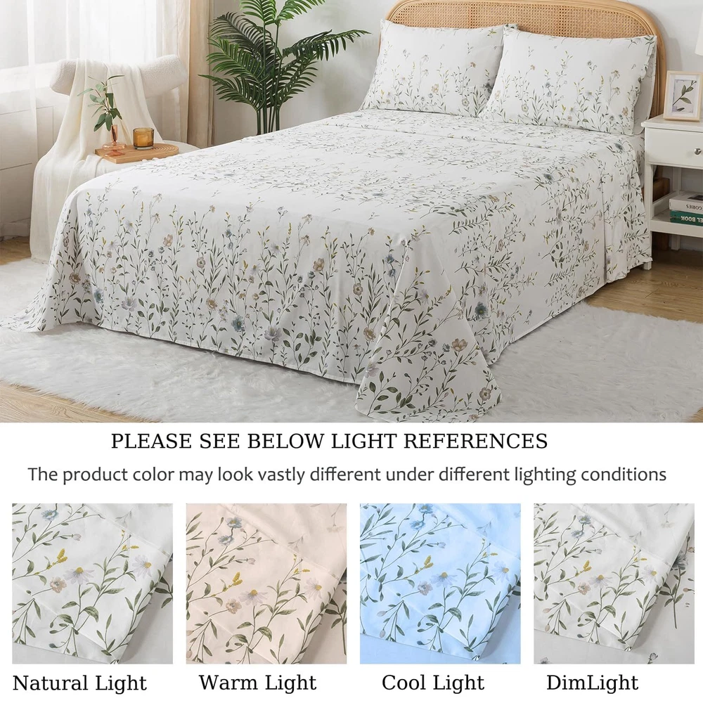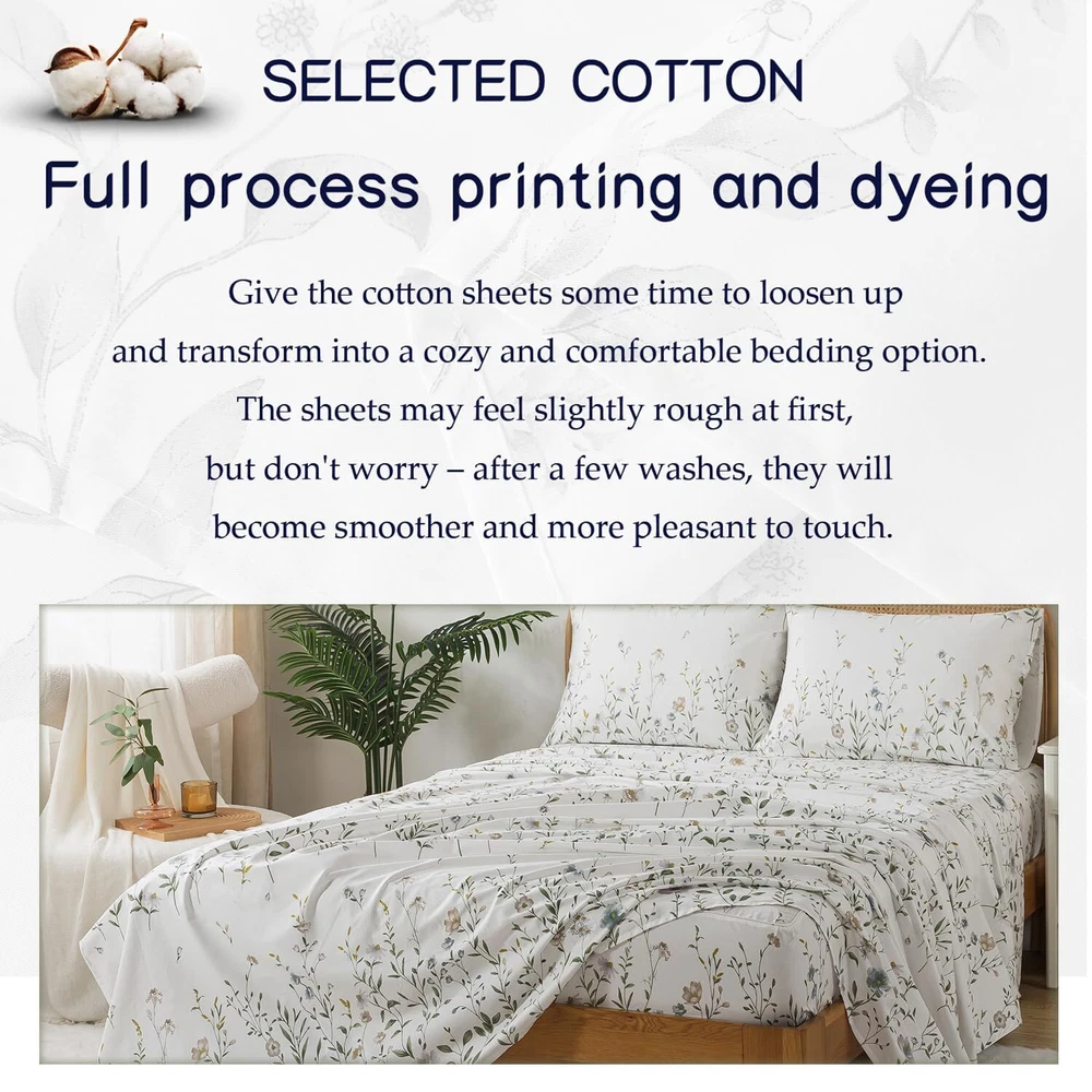 Precision Fit for Queen Mattresses - These floral bed sheets are tailored to flawlessly fit standard 60 x 80 inch queen-sized mattresses. The fitted sheet features a 360 degree elasticized skirt with 17.5-inch deep pockets to hug thicker mattresses and stay neatly in place all night. The flat sheet measures 90 x 102 inches, with ample overhang to tuck neatly beneath the mattress. Two standard 19 x 29 inch pillowcases complete the 4-piece queen sheet set. With dimensions cut to exact queen mattress specifications and details like deep pockets and full encasement elastic, these farmhouse sheets offer a perfect contour fit for your queen bed. 【Soft & Cozy 100% percale weave cotton sheets】- luxury leaves printed sheets are made of high-quality percale weave combed cotton, ultra soft,durable, fade-resistant, crisp, skin-friendly and breathable, nice for hot sleepers. Our 100% cotton sheets provide you with extra and unpredictable comfort and the best sleep ever. 【𝐐𝐮𝐞𝐞𝐧 Size Sheets info】1 Flat sheet 90''*102'', 1 Deep Pocket Fitted Sheet 60''*80''+17.5'', 2 Pillowcases 19*29''. Our fitted sheet is designed with deep pockets to accommodate mattresses up to 17 inches deep. All-around grip elastic ensures the sheet stays in place no matter how you twist and turn in bed. Enjoy a perfect and undisturbed sleep with our safe and comfortable fitted sheet. 【Fresh Design Sheets】Experience the chic off-white sheets adorned with a refreshing print for an elegant first impression. Our sheets boast deep pockets with full-elastic encasement for a secure fit. The refined piping on the fitted sheet adds a luxurious look. 【Durable & Easy Care】 Designed for deep pockets, our 17.5-inch fitted sheet offers a snug fit. Made with 360° elastic for lasting durability. Machine washable in warm water on a gentle cycle. Use non-chlorine bleach if necessary. Tumble dry on low heat. Natural Cotton Wrinkle Tip: Embrace the natural tendency of cotton to wrinkle. For a smoother finish, warm iron as needed or enjoy a few nights' sleep to soften and smooth the fabric. With each wash, it becomes softer. 【Efficient customer service】Any questions, please contact first, we will reply you within 24 hours and provide a satisfied solution.You will get professional and sweet customer service. Bedding/Sheets come with pretty package, it's a great gift idea for men and women, Moms and Dads, Grandma,Valentine's - Mother's - Father's Day, Birthday, and Christmas.