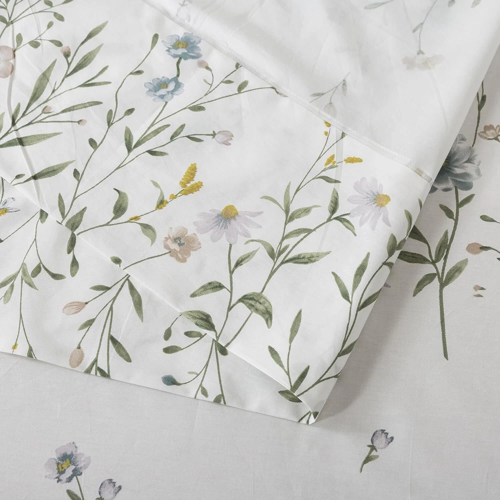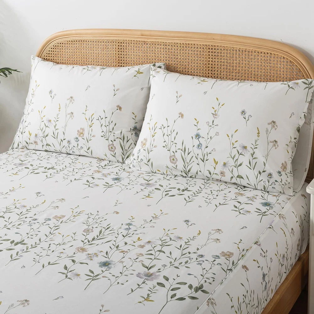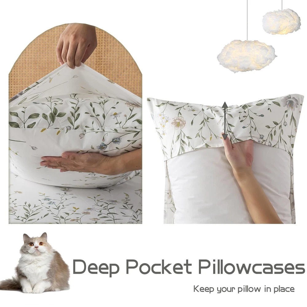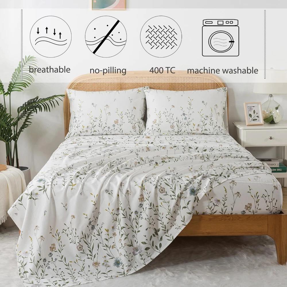 Precision Fit for Queen Mattresses - These floral bed sheets are tailored to flawlessly fit standard 60 x 80 inch queen-sized mattresses. The fitted sheet features a 360 degree elasticized skirt with 17.5-inch deep pockets to hug thicker mattresses and stay neatly in place all night. The flat sheet measures 90 x 102 inches, with ample overhang to tuck neatly beneath the mattress. Two standard 19 x 29 inch pillowcases complete the 4-piece queen sheet set. With dimensions cut to exact queen mattress specifications and details like deep pockets and full encasement elastic, these farmhouse sheets offer a perfect contour fit for your queen bed. 【Soft & Cozy 100% percale weave cotton sheets】- luxury leaves printed sheets are made of high-quality percale weave combed cotton, ultra soft,durable, fade-resistant, crisp, skin-friendly and breathable, nice for hot sleepers. Our 100% cotton sheets provide you with extra and unpredictable comfort and the best sleep ever. 【𝐐𝐮𝐞𝐞𝐧 Size Sheets info】1 Flat sheet 90''*102'', 1 Deep Pocket Fitted Sheet 60''*80''+17.5'', 2 Pillowcases 19*29''. Our fitted sheet is designed with deep pockets to accommodate mattresses up to 17 inches deep. All-around grip elastic ensures the sheet stays in place no matter how you twist and turn in bed. Enjoy a perfect and undisturbed sleep with our safe and comfortable fitted sheet. 【Fresh Design Sheets】Experience the chic off-white sheets adorned with a refreshing print for an elegant first impression. Our sheets boast deep pockets with full-elastic encasement for a secure fit. The refined piping on the fitted sheet adds a luxurious look. 【Durable & Easy Care】 Designed for deep pockets, our 17.5-inch fitted sheet offers a snug fit. Made with 360° elastic for lasting durability. Machine washable in warm water on a gentle cycle. Use non-chlorine bleach if necessary. Tumble dry on low heat. Natural Cotton Wrinkle Tip: Embrace the natural tendency of cotton to wrinkle. For a smoother finish, warm iron as needed or enjoy a few nights' sleep to soften and smooth the fabric. With each wash, it becomes softer. 【Efficient customer service】Any questions, please contact first, we will reply you within 24 hours and provide a satisfied solution.You will get professional and sweet customer service. Bedding/Sheets come with pretty package, it's a great gift idea for men and women, Moms and Dads, Grandma,Valentine's - Mother's - Father's Day, Birthday, and Christmas.