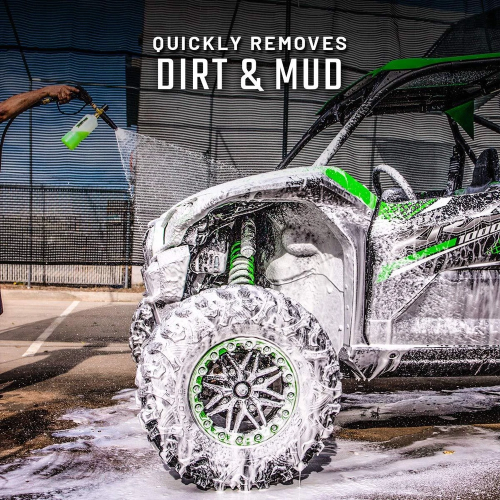PREMIUM WASH SOLUTION WITH PROFESSIONAL RESULTS : offroad car care products are specially formulated with high-quality ingredients designed to offer users a faster, safer, and easier cleaning experience wash after wash. Our Super Concentrated Off-Road Wash is exactly what you need to maintain the life, look, and value of your vehicle for years to come. EASY HOME AND PRO USE : Whether you're a professional in car detailing or you want to wash your truck, dirt bike, or UTV at home, our off-road vehicle wash is perfect for you. The foamy auto detailing wash works to get rid of all the tough dirt and mud on surfaces making it easy to achieve a professional shine. VALUE FOR YOUR MONEY : Getting a showroom shine doesn't have to take hours of detailing. Make your next dirt bike, truck, or car wash fast, fun, and spotless with our off-road motorsport cleaning solution. Each bottle is the equivalent of 16 pre-mixed quart bottles. Just mix 4-8 ounces of the green soap with 1 Gallon of water. Our off-road concentrated wash works great with any foam cannon, foam gun, sprayer, or bucket for easy washing of your offroad vehicles. SUPERIOR CLEANING WITHOUT STRIPPING LUBRICATION : Maintain the life, look and value of your off road vehicles with our super concentrated cleaning solution. This off road wash is specially formulated to quickly penetrate heavy dirt, mud and target grime without stripping essential lubrication from bearing or pivot points leaving a streak-free, like-new shine to your vehicle. SAFE FOR ALL FINISHES : You can safely apply our non corrosive wash to aluminum, anodized parts, other metal surfaces, paint, plastic, rubber, and bearings without etching, fading, or discoloring surfaces. This pH balanced heavy duty truck and car cleaner is designed for exterior use on your dirt bike, truck, ATV, UTV, Trailer, Lawn Equipment, heavy machinery, and other off road vehicles.