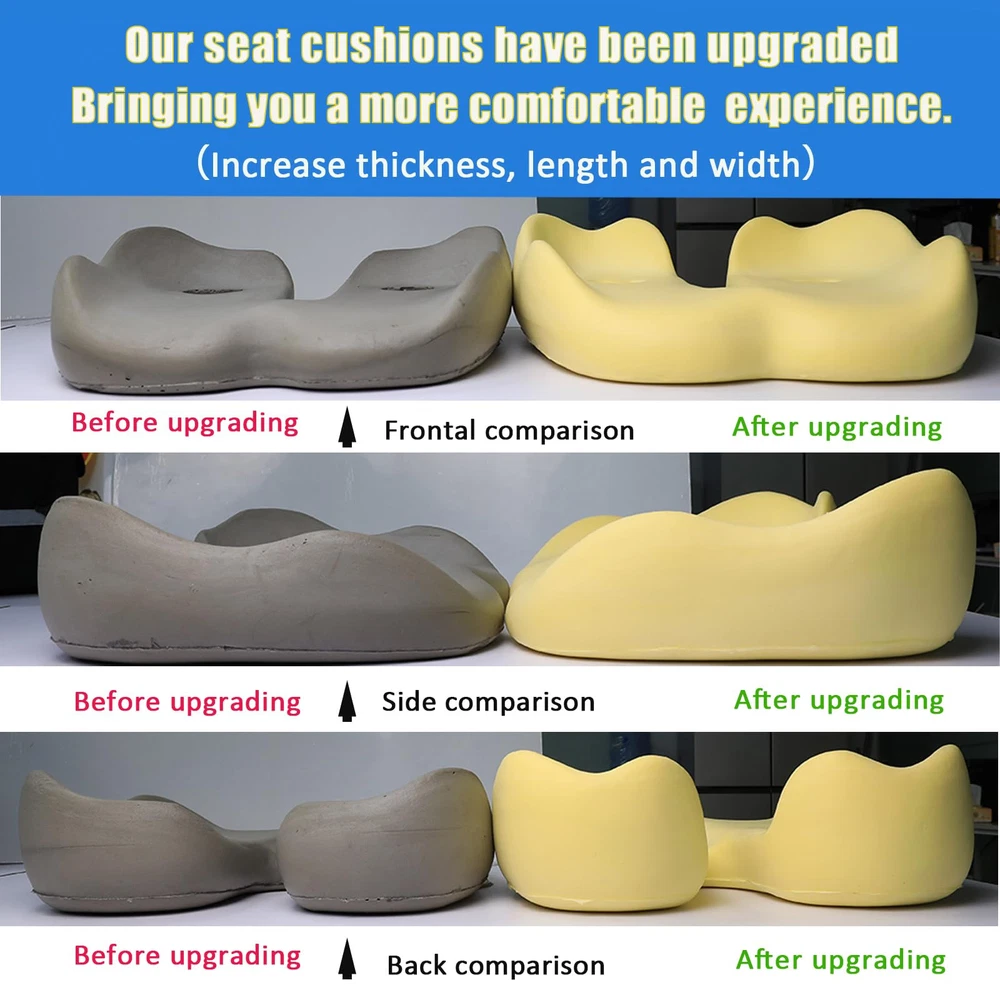 Universal Use: Our Back Cushions & Seat Cushions are designed for universal use, making them perfect for any chair, car seat, or office chair. Whether you need extra support at work or comfort during long drives, our cushions are versatile and adaptable to all purposes. Premium Memory Foam: Crafted with high-density memory foam, our cushions offer slow rebound and exceptional support. The thick memory foam ensures long-lasting comfort and helps relieve pain associated with prolonged sitting. Ergonomic Design: Our cushions are thoughtfully designed with exceptional ergonomics in mind. The contour shape provides optimal support to your back, encouraging proper posture and reducing strain on your spine. Say goodbye to discomfort and hello to a more comfortable seating experience. What makes it different from other cushions: 1. Enlarged and thickened, it's bigger and more supportive than most of cushions in the market. 2. The cover is really well-made (both in material and craftsmanship), making it more comfortable and durable. Adjustable and Versatile: It comes with adjustable strap that allows for easy attachment to any chair or seat. Preventing the cushion from slipping or shifting. Enjoy customized comfort wherever you go.