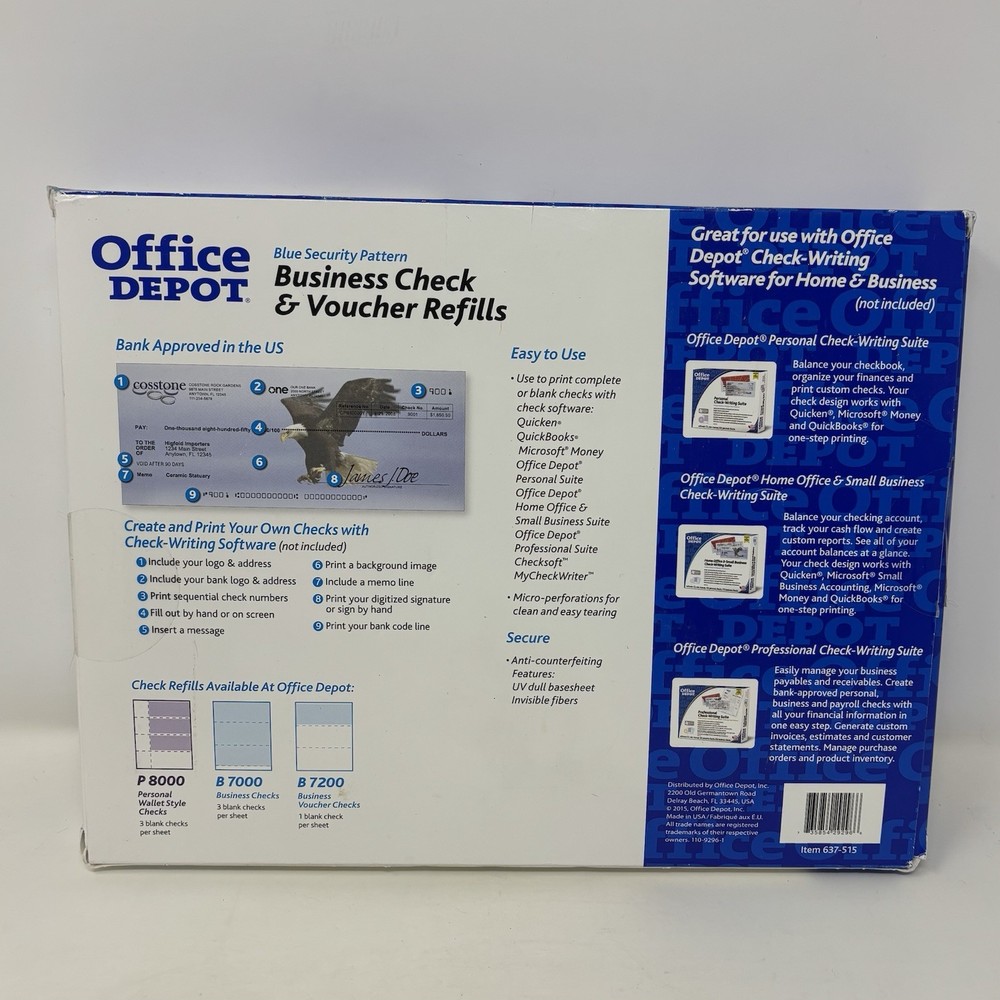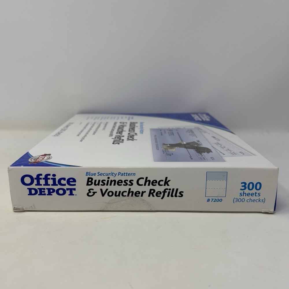 Office Depot 300 Business Check & Voucher Refills Use w/ Quickbooks Checksoft + Brand new and unused in open box. Refer to images for details. The Office Depot 300 Business Check & Voucher Refills are blank checks specifically designed for use with Quickbooks Checksoft +. Made by Office Depot in the United States, these check and voucher refills come in a pack of 300 and are perfect for businesses looking to streamline their accounting and record-keeping processes. These high-quality checks provide a convenient and efficient way to manage and organize financial transactions within a business setting.