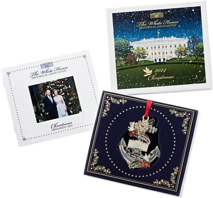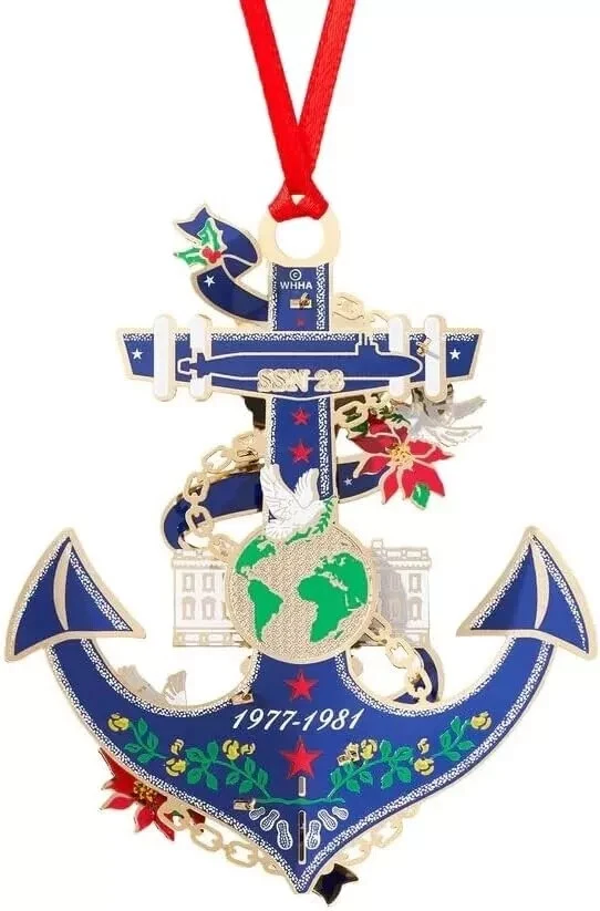 About This Product Made from solid brass, finished in 24-karat gold and screen printed with exquisite color, the Official 2024 White House Christmas Ornament honors President Jimmy Carter, the thirty-ninth President of the United States, the ornament's anchor shape, an iconic symbol of hope, represents Carter's service in the United States Navy. Design Details: The North Portico of the White House is shown adorned with poinsettias that harken back to the vibrant and festive White House Christmases he shared with his family. Both the front and reverse side of the ornament feature peace doves, symbolic of President Carter's work for peace in the Middle East and perhaps most significantly, the Egypt-Israel Peace Treaty signed on the North Lawn of the White House on March 26, 1979. On the reverse side of the ornament is the Seawolf-class USS Jimmy Carter (SSN-23), the globe at the center refers to Carter's lifelong work on environmental conservation, at the base of the anchor is a garland of peanut flowers, a reminder of Carter's years as a farmer and businessman in Plains, Georgia, this ornament ships with a ribbon for hanging in a keepsake box with an illustrated booklet on the Carter presidency. Every ornament ships in a keepsake box with a ribbon for hanging and an illustrated booklet on the Carter presidency. Highlights Official 2024 white house Christmas ornament honors the life and presidency of jimmy carter Shape and emblems on the ornament represent different parts of president carter's life Ships in a keepsake box with a ribbon for hanging and an illustrated booklet on the carter presidency Made from solid brass, finished in 24-karat gold
