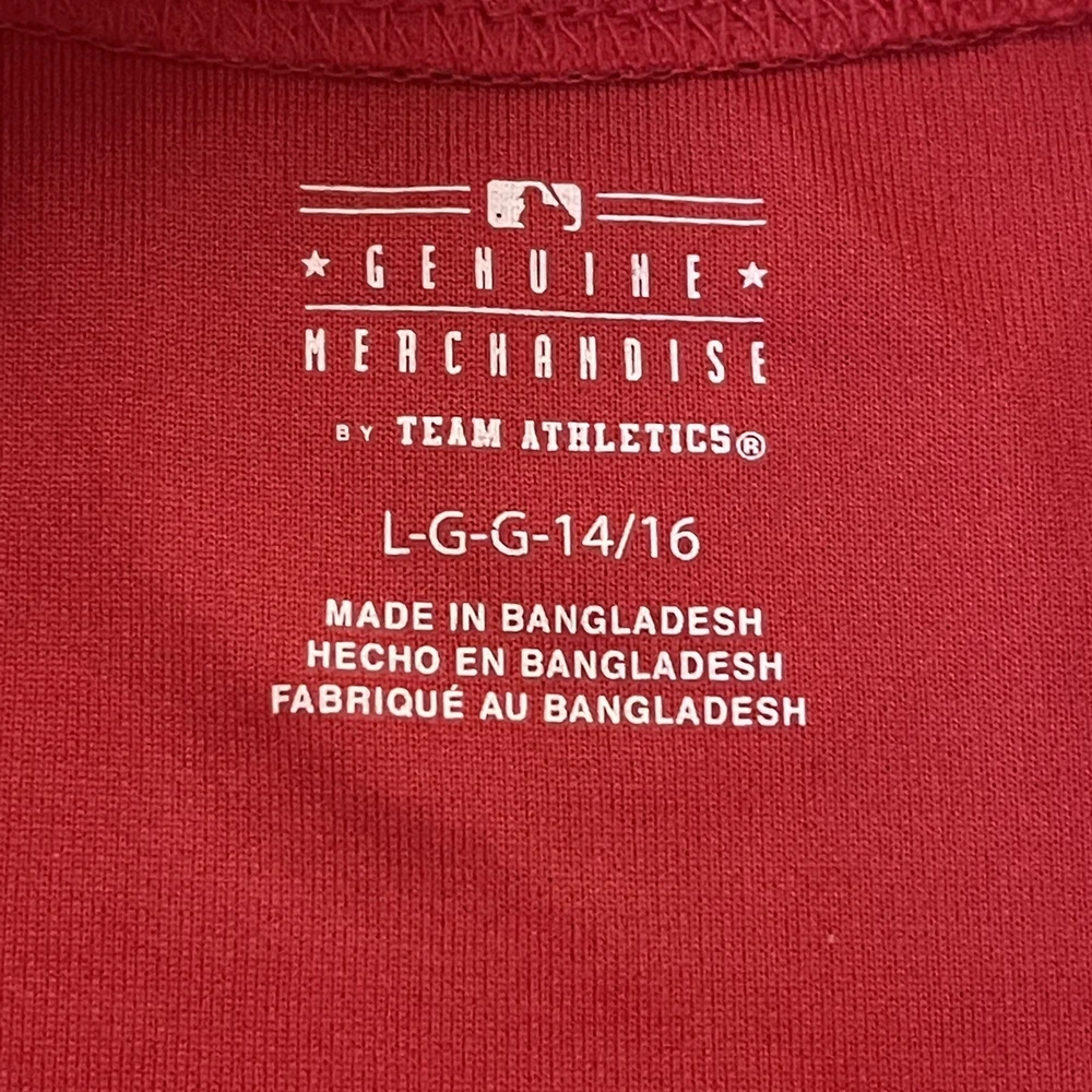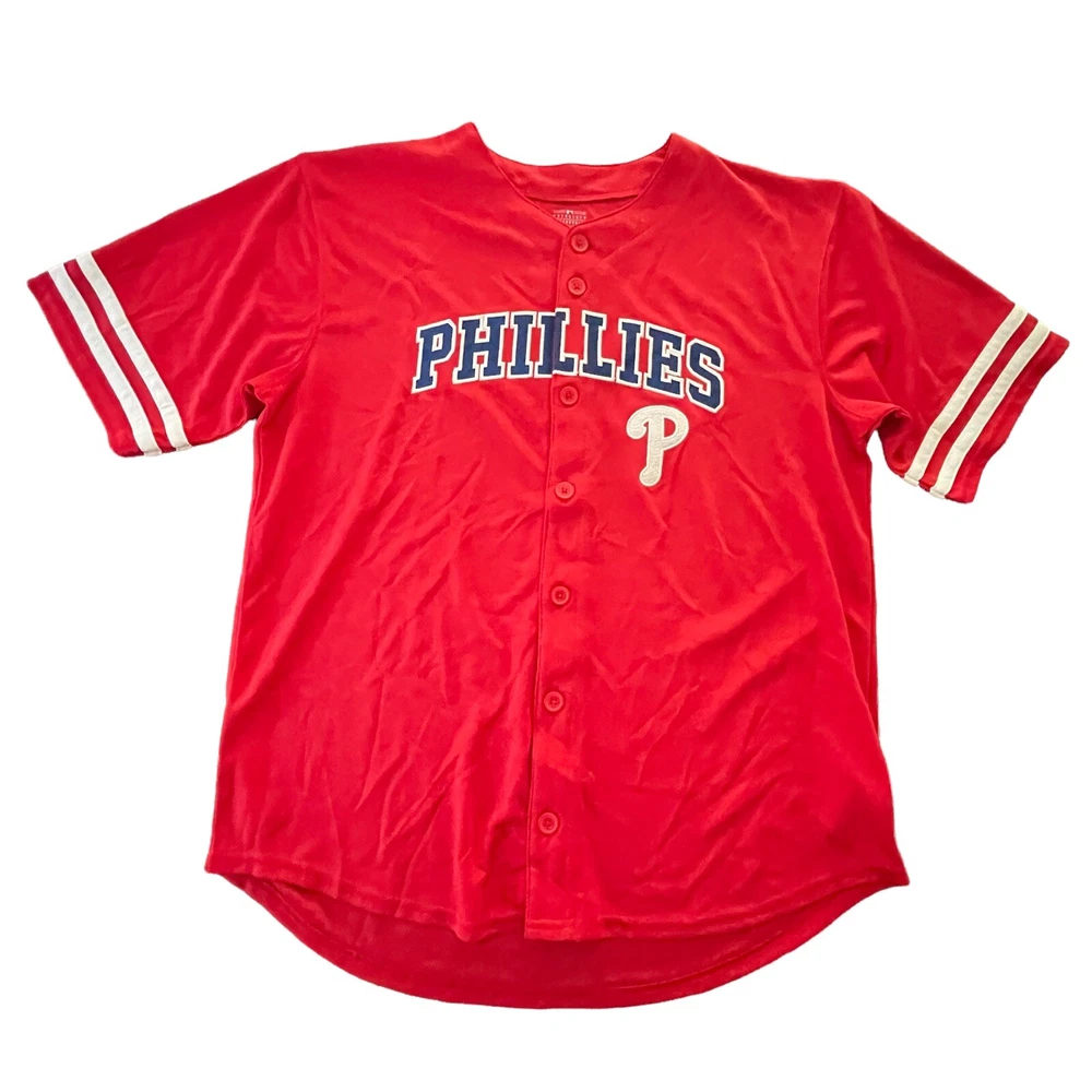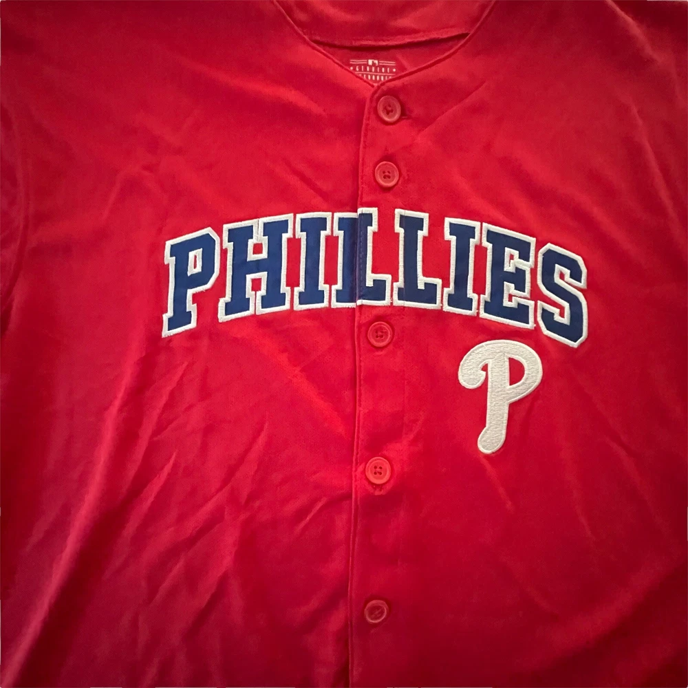 UPC: Does not apply Team: Philadelphia Phillies Seller Notes: “Excellent condition. No tears or stains. Worn once - like new.” Size: YL 14/16 Material: 100% Polyester exclusive of decoration Gender: Unisex Children Brand: Genuine Merchandise by Team Athletics Country/Region of Manufacture: Bangladesh Pre & Post Season: Regular Season Product: Jersey gtin13: Does not apply Color: Red