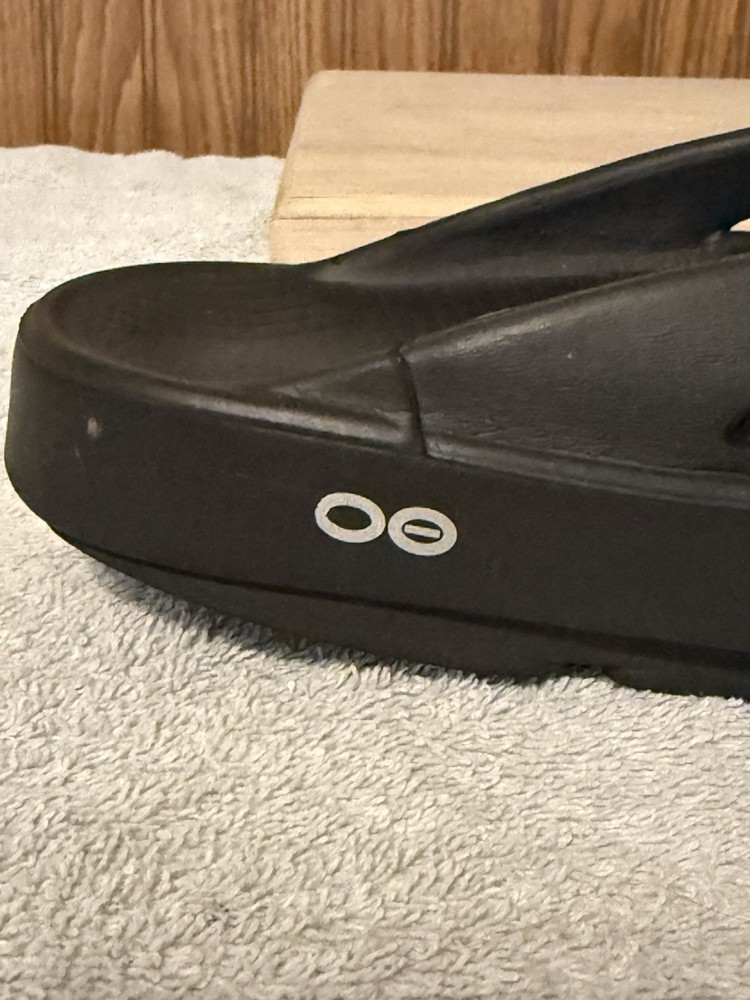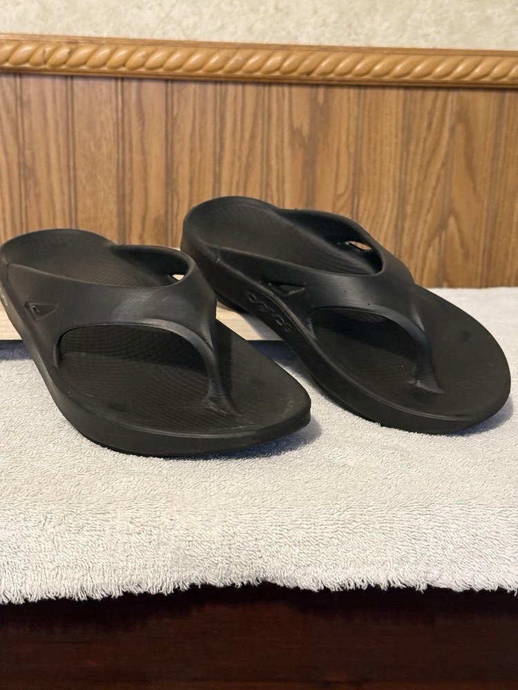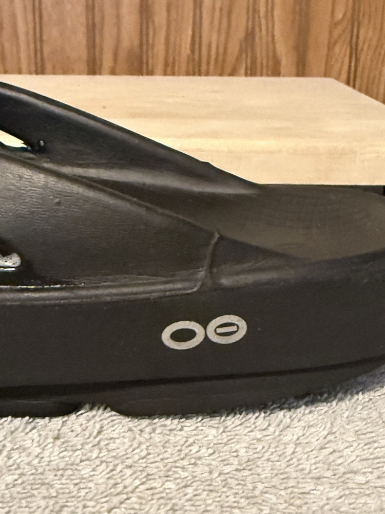 Explore the blend of comfort and style with these OOFOS unisex black flip flops, perfect for both casual wear and athleisure activities. Designed with a sleek rubber upper and a versatile black hue, these sandals easily transition from a day at the beach to a bike ride around town. Offering a low heel height for all-day wearability, these size 6 men (size 8 women, EU 39) sandals boast a durable construction made for the young and young at heart. Whether it's a laid-back day or a casual outing, these OOFOS flip flops deliver on both comfort and style.