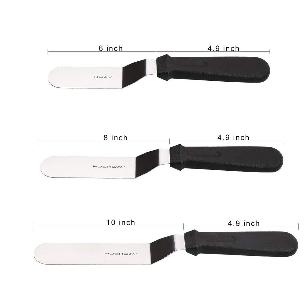 We bring to you a set of premium quality offset spatula that go great with any modern and stylish kitchen. Our functional gadgets, tools, food-prep items and household products make cooking and meal preparation more efficient and fun. Get the Right Tool for the Job! Buying this 3 pc angled icing spatula set: ➢Sturdy blade allows to cut cakes and curds. ➢It is easier to put icing on your homemade cakes. ➢Comfortable textured handle that doesn't tire your grip. ➢The consistency is fine for piping small outlines & details. ➢The blade sizes are six and eight inches with a textured handle. It is a great size range to make cupcakes as well as larger cakes. ➢Perfect for decorating Wedding cakes, Birthday cakes, biscuit, cookie Cream Decoration, cupcakes, hot chocolate, Egg Tart, holiday desserts,etc Contents: One 6” Black Icing Spatula One 8” Black Icing Spatula One 10” Black Icing Spatula The Stainless steel cake icing spatula is best ideal for cake decorating and other pastries.The kitchen helpers can be used, among other things, to spread the cream and jam, decorate the cake, or detach it from the mold. Three Professional Cake Decorating Spatulas: Our offset spatula set comes in three different sizes: 6" - 8" - 10" blade, This is your best choice to decorate a cake perfectly. Finest Quality and Dishwasher Safe: Unlike cheap wooden handle that leaves dirty paint marks and scratchy stainless steel blade spatulas of our competitors. Designed with textured handles for a good grip. Top-quality flexible and durable stainless steel blades make us stand out of the crowd. Multifunction Use: The offset cake decorating knives can help frost hard to reach areas without your hands getting in the way. It's great for icing cakes, cheese, pizzas, sandwiches, cookie, cupcake even cutting curds. Great Ergonomic Design: The ergonomic handle of the angled icing spatula is lightweight and very comfortable to hold with a firm grip while angled blades. The strong and durable blade of each angled icing spatula has a smooth surface, very easy to clean. Start to decorate your favorite cake now!
