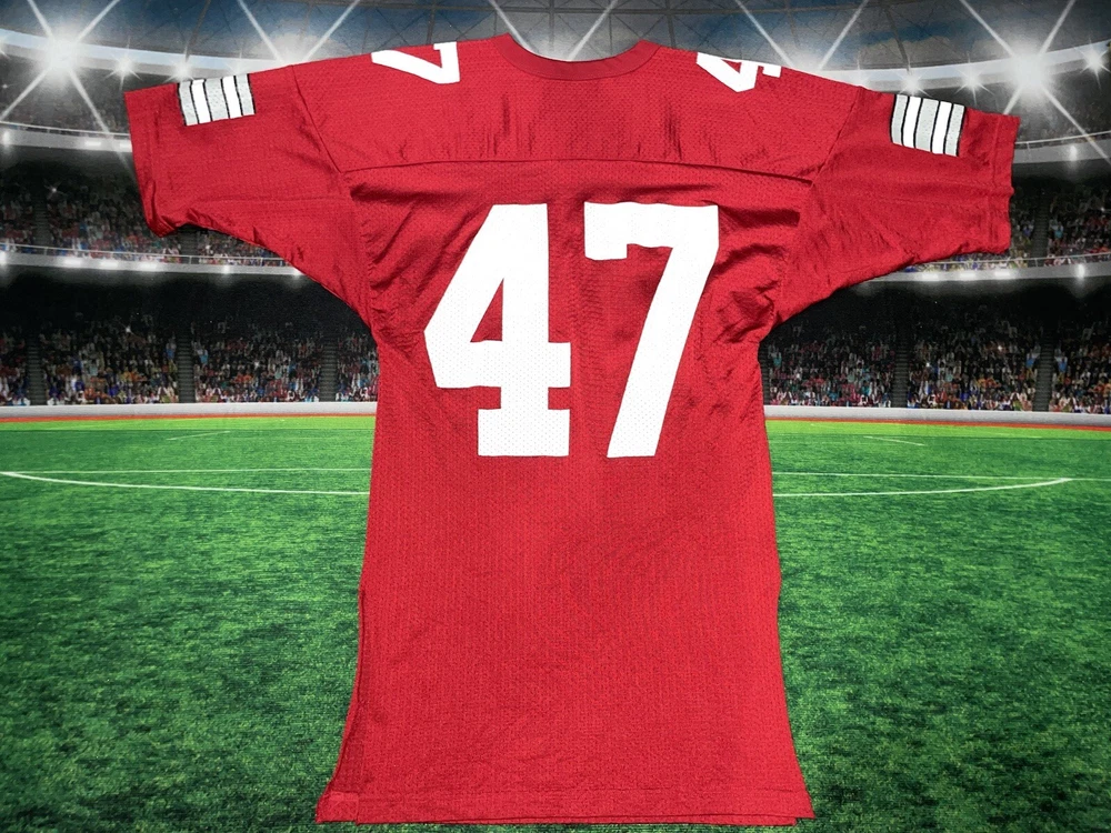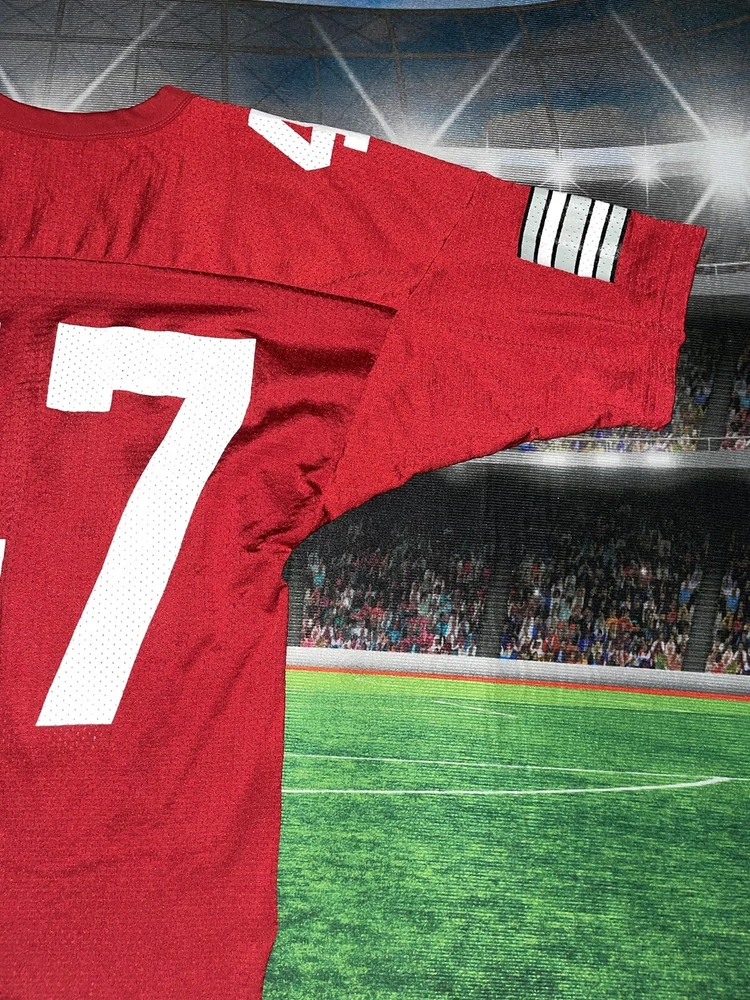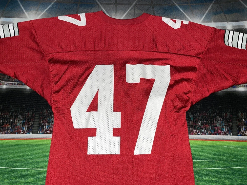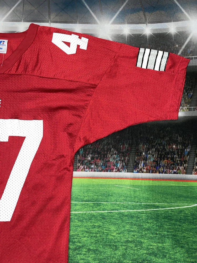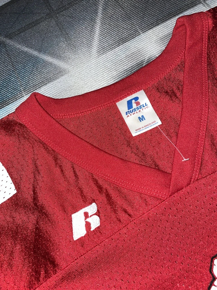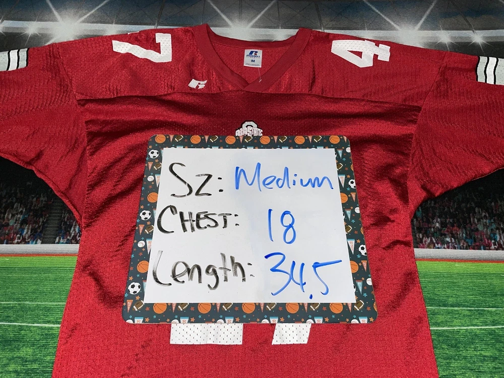 Show your Buckeyes pride with this preowned Russell Athletic jersey featuring AJ Hawk's #47. Perfect for any Ohio State fan, this unisex adult jersey is made of high-quality materials and designed for comfort. Whether you're heading to the game or just want to show off your team spirit, this red jersey is sure to turn heads. The jersey is sized as a medium and features the iconic Buckeyes logo on the front. It's ideal for football season or any occasion where you want to show your support for the Ohio State Buckeyes. Don't miss out on this must-have fan apparel piece! Note: it’s modified on the sides