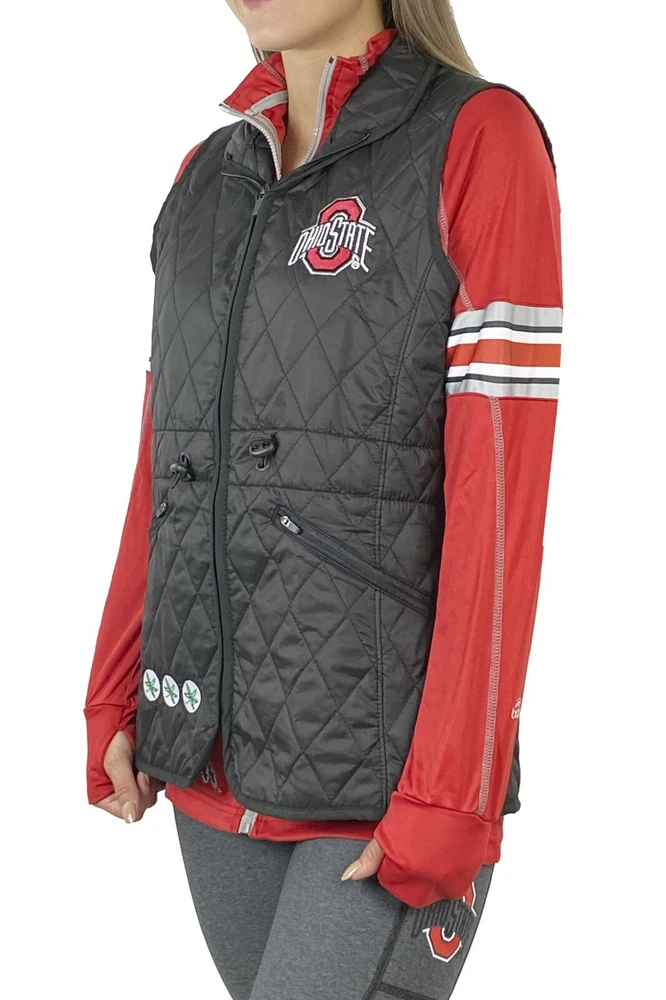 New With Tags $65 Retail Womens Lightweight Quilted Vest Zipper Pockets Toggles at Waist Full Zip Moisture Wicking Longer Silhouette 90% Poly/10% Spandex Three Embroidered Buckeye Leaves on the bottom right hem Embroidered Block O Logo on Chest