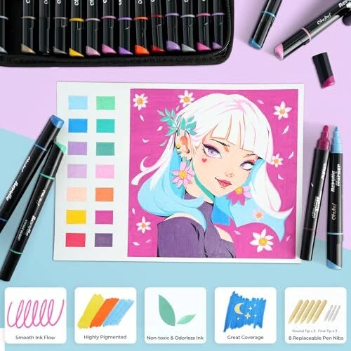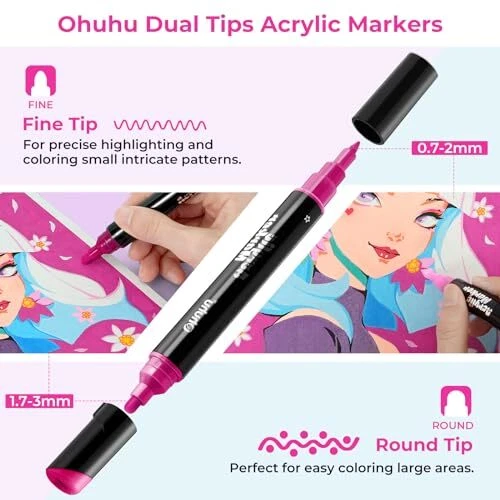 DUAL MEDIUM ROUND & FINE TIPS: Double the tips, double the possibilities. Each acrylic paint markers features two different tips - 0.7-2mm fine tip and 1.7-3mm round tip. Just use the round tips for large swaths of color and the fine tips for delicate details, like outlining and embellishing. 30 UNIQUE VIBRANT COLORS: Each set includes 15 basic colors, 9 metallic colors and 6 fluorescent colors for your unlimited and imaginative creation. 9 special metallic colors for shining and embellishment can be used to draw flowers or people, such as eye shadows and makeup. Whether you're an illustrator, craft addict, or a DIY enthusiast, the Ohuhu 30-color paint pens has got you covered! HIGH OPACITY: With vibrant and concentrated water-based ink, Ohuhu acrylic pens are non-toxic, odorless and draws smoothly, enabling you to easily layer with high opacity. Highly suitable for budding beginners or seasoned artists. WATERPROOF & LIGHTFAST: With the ink's water-resistance and sun-resistance properties, you can create art masterpieces that never fade. The ideal choice for longer-term art projects like graffiti, marking, painting, coloring and more! WORK ON ASSORTED SURFACES: Let your imagination run wild with the Ohuhu 30 pc. dual tip rock painting pens! You can draw on a variety of surfaces, from rocks, stones, wood, fabric, ceramic, mugs, glasses, plastic, paper, eggs, canvas! SHAKE WELL BEFORE USE: Using the acrylic paint markers for wood is as easy as it can be! Just shake the barrel, press the tip and you're good to go! Remember to cap your marker after each use to prevent the ink from drying. Comes with 8 extra tips (5 round tips and 3 fine tips) for your convenience.