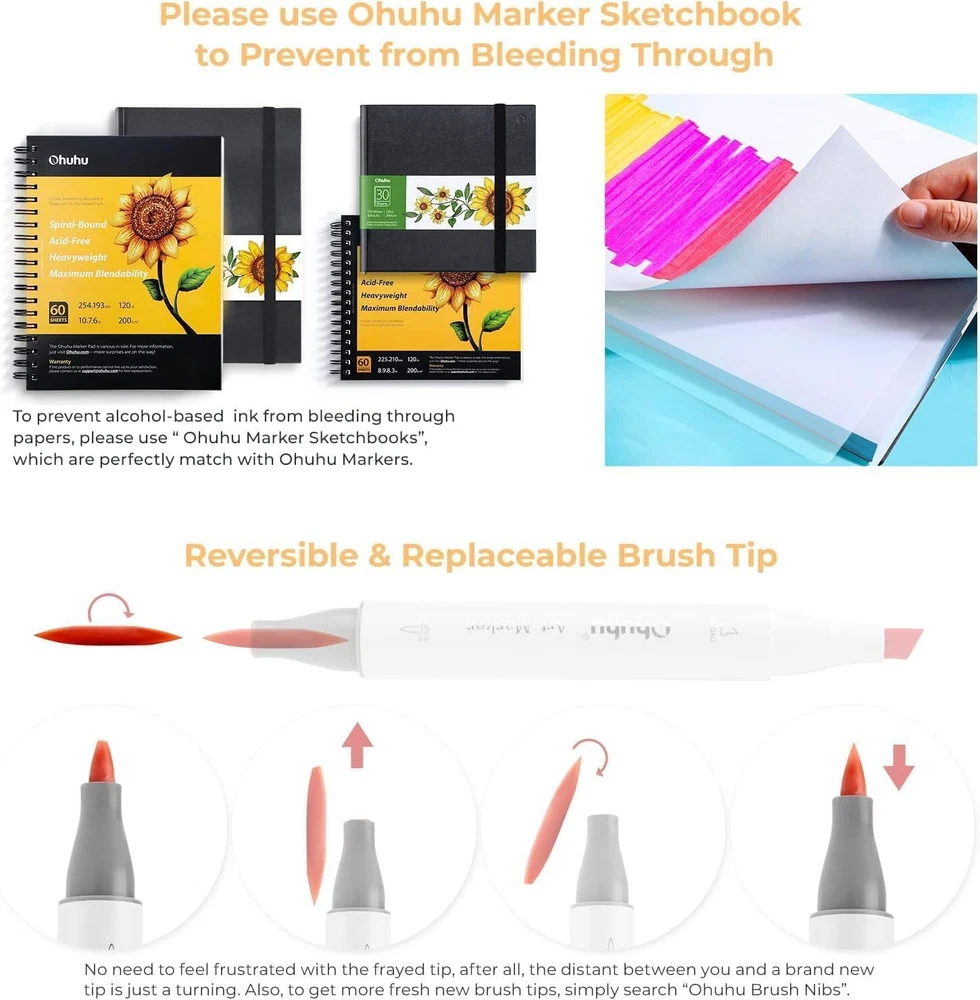 Take their coloring game to the next level! Whether it's for a budding artist or a coloring master, the Ohuhu Dual Tip Brush Marker Pen Set is a must-have for any creative toolbox. Easy to blend and mix, the 48 brilliant colors offer an almost unlimited palette of potential. And for any artist, versatility is key. Each dual-tip brush marker pen features both a brush tip and a fine tip for details of drawing styles - this is the only marker set you'll ever need! BRUSH & FINE, DOUBLE-TIP, DOUBLE THE FUN: Widen your artistic horizons with the dual-tip marker design! Choose the brush tip for sweeping, calligraphic strokes or the fine tip for details. What's more, now Ohuhu replacement brush tips is available, so you can easily replace the worn-out tips to ensure consistent and precise lines whenever you create. The only limit is your imagination REFILLABLE INK FOR A LIFETIME OF CREATIVITY: With 51 Ohuhu popular colors available for refills now and more on the way, your creativity knows no bounds. Enjoy a wide range of hues and keep your markers going for years to come. Whether you're exploring the rich colors of Honolulu, Oahu, the Kaala, or the bold hues of Molokai Series, they are refillable now. Switch between sets seamlessly and unlock endless artistic possibilities SEAMLESSLY BLENDING: Say goodbye to unsightly splotches and uneven coloring. Our high-quality ink seamlessly blends to create beautiful, professional-grade artwork, perfect for both beginners and experienced artists; Also, no more frustrating smudges or wet ink ruining your work. Our alcohol-based ink dries quickly, ensuring that your art is always clean, crisp, smudge-free, and ready to display 48 VIBRANT COLORS + 1 COLORLESS BLENDER : The rainbow is at your fingertips - choose from 48 brilliant colors and bring your ideas to life. The color spectrum is yours to explore with 48 brilliant shades to choose from, plus a colorless blender for better blending effects. From coloring books to professional masterpieces, our brush markers will breathe life into your artwork EASY IDENTIFICATION, ORGANIZATION & PORTABILITY: Don't waste time searching for the perfect color. Our markers come with color-coded caps to keep you organized and efficient. Plus, the free carrying case makes these markers perfect for any coloring adventure or as a thoughtful gift for any artist