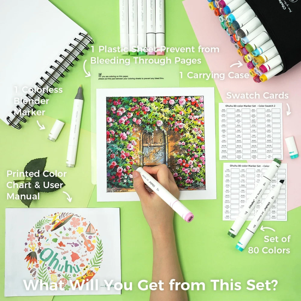 The Ohuhu Marker Pens are the highly pigmented colors you're missing in your collection. They are built with dual tips that are fine, narrow and broad to allow you to be creative with a variety of vibrant color options. This is the perfect Christmas gift and addition for artists, students, kids, and more for arts and crafts, design etc. Correct Ways to Remove Caps: 1. Make the cap loose first to let air in; 2. Then remove the cap gently. Important Notes: 1. For optimal performance please ensure the marker caps are secure when they are not in use. 2. Please do not pull the cap directly and roughly, since the different air pressure inside and outside the caps may lead the ink to leak out. Specifications: -Weight: 3lbs -Pen Size: 5.9 inch long -Color: 80 colors Package Includes: -80 x Marker Pen -1 x Black Carry Case -1 x Warranty Card Seller Warranty -12-Month Replacement Warranty -30-Day Money Back Guarantee -Lifetime Support Guarantee CHISEL & FINE, DOUBLE-TIP, DOUBLE THE FUN: Create precise details with the fine tip, while add texture, a variety of marks and quickly color in large areas with the wide chisel tip. The only limit is your imagination REFILLABLE INK FOR A LIFETIME OF CREATIVITY: With 51 Ohuhu popular colors available for refills now and more on the way. Enjoy a wide range of hues and keep your markers going for years. Whether you're exploring the rich colors of Honolulu, Oahu, the Kaala, or the bold hues of Molokai Series, they are refillable now. Switch between sets seamlessly and unlock endless artistic possibilities. Elevate your artwork with Ohuhu markers, designed for a lifetime of creativity SEAMLESSLY BLENDING: Say goodbye to unsightly splotches and uneven coloring. Our high-quality ink seamlessly blends to create beautiful, professional-grade artwork, perfect for both beginners and experienced artists; Also, no more frustrating smudges or wet ink ruining your work. Our alcohol-based ink dries quickly, ensuring that your art is always clean, crisp, smudge-free, and ready to display 80 VIBRANT COLORS + 1 COLORLESS BLENDER : Add dimension to your art with the superior blendability of dye-based ink. The set includes 80 unique, brilliant colors and a colorless blender for endless creativity, which is a must-have working tool in many fields of design, illustration and fine art EASY IDENTIFICATION, ORGANIZATION & PORTABILITY: Don't waste time searching for the perfect color. Our markers come with color-coded caps to keep you organized and efficient. Plus, the free carrying case makes these markers perfect for any coloring adventure or as a thoughtful gift for any artist