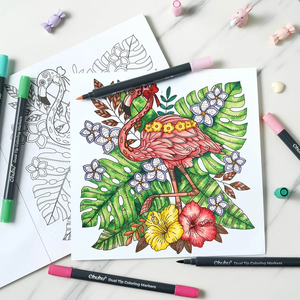 DELUXE COLORING BOOK: Make your artwork come to life! Ohuhu coloring book comes with 36 pieces of 110 gsm bleed-proof heavyweight paper that prevent smudging, bleeding, and feathering for clean artwork. Measuring 8.5 by 8.5 inches, the book provides ample space for your imagination to run wild. Plus, to find out the best color combo, you can try on the corresponding scale-down templates first! DUAL TIPS, DUAL POSSIBILITIES: We know your creativity is limitless, and Ohuhu drawing pens are here to help you unleash it with double wear-resistant tips—brush and fine! The 1mm fine tip can glide through the details for intricate coloring, writing, and doodling, while the 1-3mm flexible brush tip flows through the large area art projects for shading, coloring, blending, and more. 48 HIGHLY PIGMENTED COLORS: There are more one-of-a-kind artworks than ever thanks to the 48 vibrant color choices! The basic colors and skin tone colors go hand in hand to work out the best color scheme for your drawing, coloring, sketching, doodling, etc. Better yet, the color-coded and printed color number allows you to spot your desired color in a breeze. WATER-BASED INK, QUICK-DRY AND NON-BLEEDING: Ohuhu water-based ink covers all the features that a decent ink needs: sustainable, non-toxic, safe,quick-dry, non-bleeding and conforms with ASTM D-4236. Ohuhu marker pens are safe for your paper sheet and yourself. In addition, 2.2g large capacity of the ink and smooth ink flow ensure your imagination never misses a beat! ALMIGHTY GIFT: Ohuhu coloring book & art pens is your passport to an artistic wonderland that knows no bounds! Ohuhu marker set is perfect for calligraphy, planners, scrapbooks, posters, artist decoration and more. For effortless organizing and storage, we’ve adopted sustainable paper package and included recyclable marker tray--- no more marker clutter!