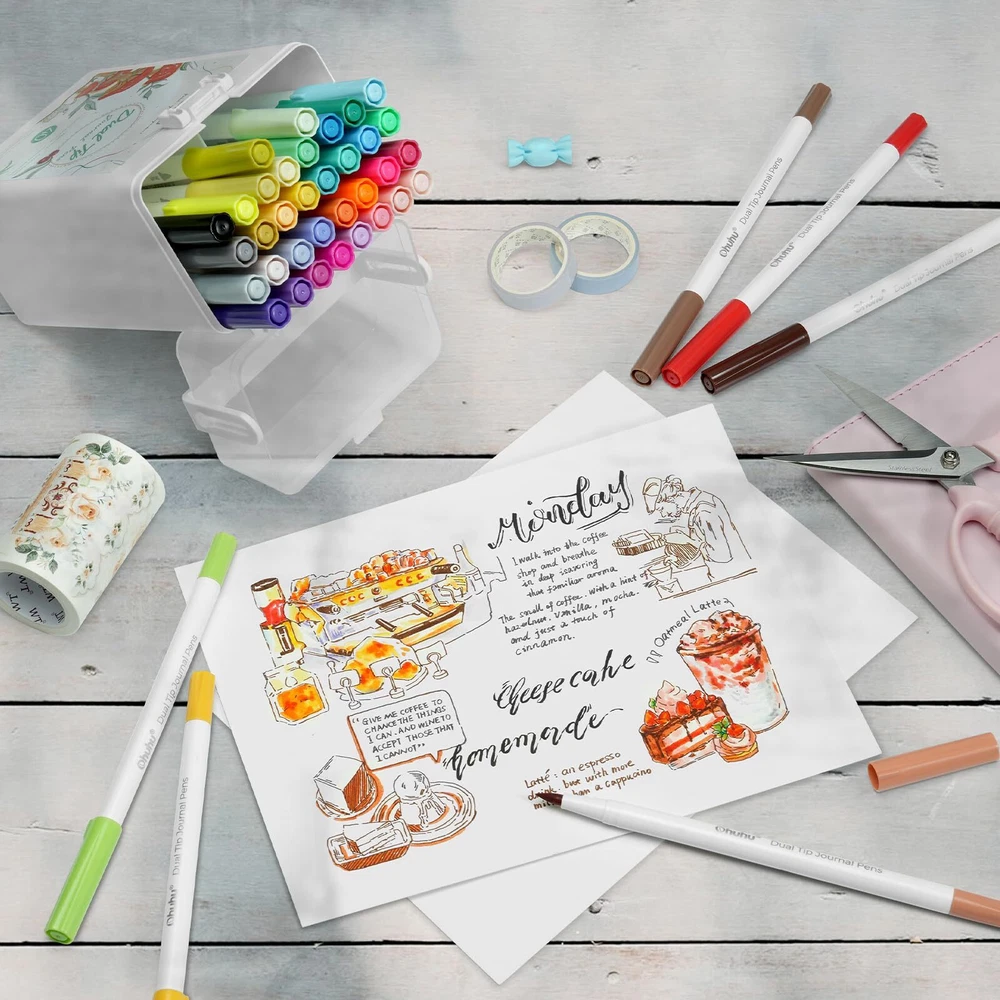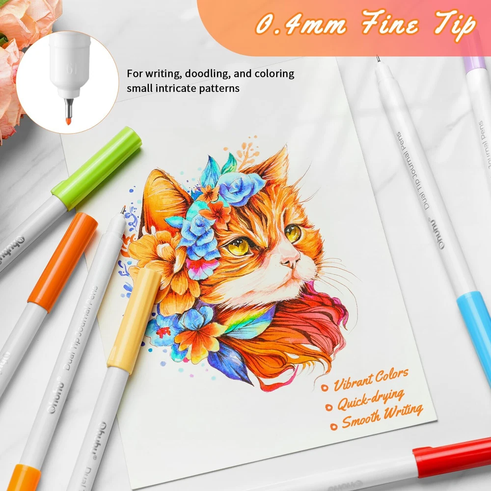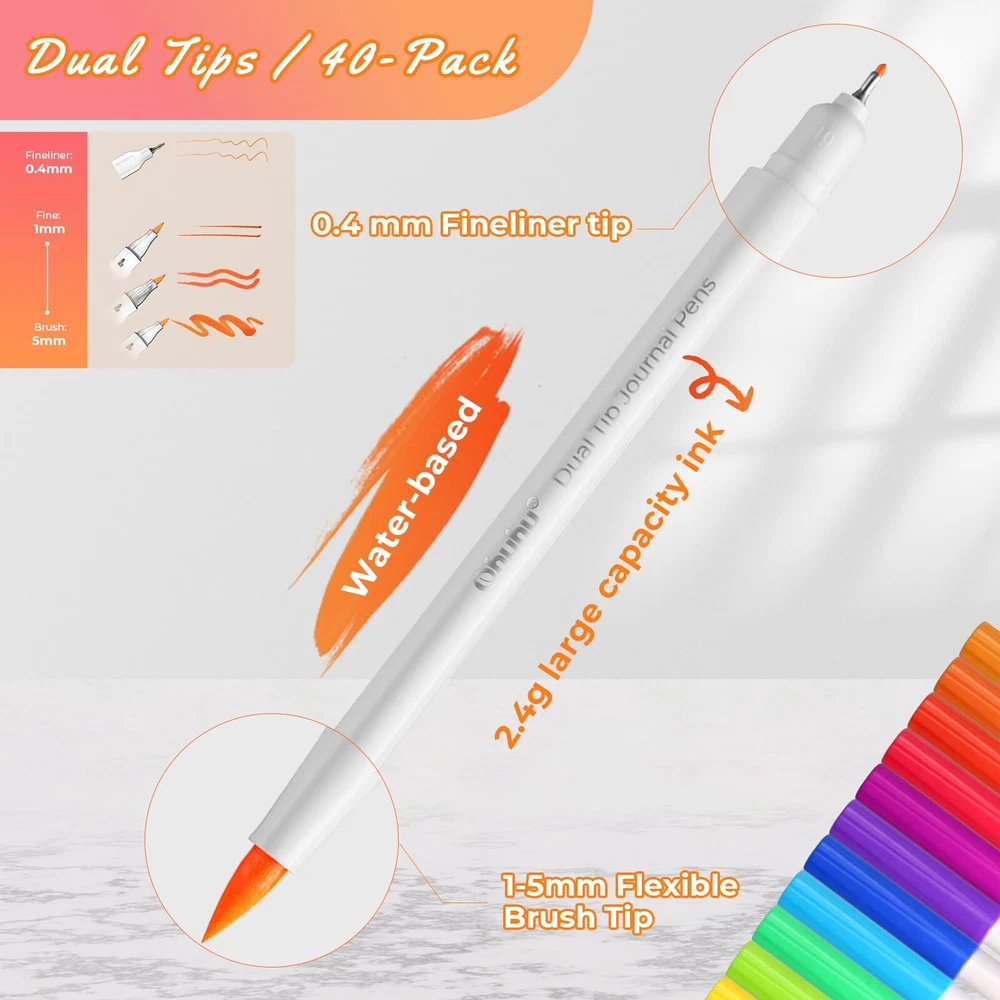 Take control of your creativity! With double-ended tips, you have the power to control line widths and unleash your artistic potential. Whether you're an aspiring artist or a seasoned pro, ohuhu markers brush tip offer versatility and precision to bring your ideas to life. Boasting 40 richly pigmented colors, Ohuhu coloring pens for adult coloring books are your go-to tool for writing, drawing, coloring, and more. Find your hue in a snap. Each colored markers bulk features a color label, allowing you to locate your desired shade instantly. Better yet, the safe water-based ink ensures your artwork stays clean and crisp. Just surprise your loved ones and artistic friends with a gift that sparks their imagination and brings joy to their artistic pursuits. DUAL BRUSH & FINELINER TIPS, DOUBLE YOUR CREATIVITY: Ohuhu art pens feature durable dual tips with smooth ink flow. Specially designed for bullet journal, the 0.4mm extra fine tip can glide through the details for intricate coloring, writing, drawing and doodling with fluid precision while the 1-5mm more flexible brush tip flows through the large area art projects for shading, coloring, blending and more, perfect for creating interesting pattern to design your journal. WATER-BASED INK, QUICK-DRY & NON-BLEEDING: What makes Ohuhu brush markers for adults so impressive is that 2.4g large capacity ink is not only quick-dry but non-toxic, odor-free, and acid-free. It’s ASTM D-4236 certified for your safety. Better yet, Ohuhu drawing pens won’t bleed or smudge after multiple layering. 40 HIGHLY PIGMENTED COLORS FOR BULLET JOURNAL: Ohuhu art pens adds many pastel and neon colors, ideal for bullet journal. Rich color sets fully meet your needs in various occasions such as coloring, drawing, calligraphy, and sketching and more. The ink color is the same as the cap color and each journaling pens is numbered for easier finding your colors fast. WHAT YOU WILL GET: A blank DIY color swatch card is included so that you can edit and organize the colors for your preferences. The PP material packaging box with handle is helpful for storing and organizing the marker set, and it is environmentally friendly and easy to carry. TO ACHIEVE WATERCOLOR EFFECTS: The ink is water-soluble and you can achieve beautiful watercolor effects by pre-wetting an area first with an aqua brush pen (not included) and then color the area with the colors you want to blend. Note: Since it needs water to blend the colors, please use watercolor paper or mix media paper to prevent bleeding.