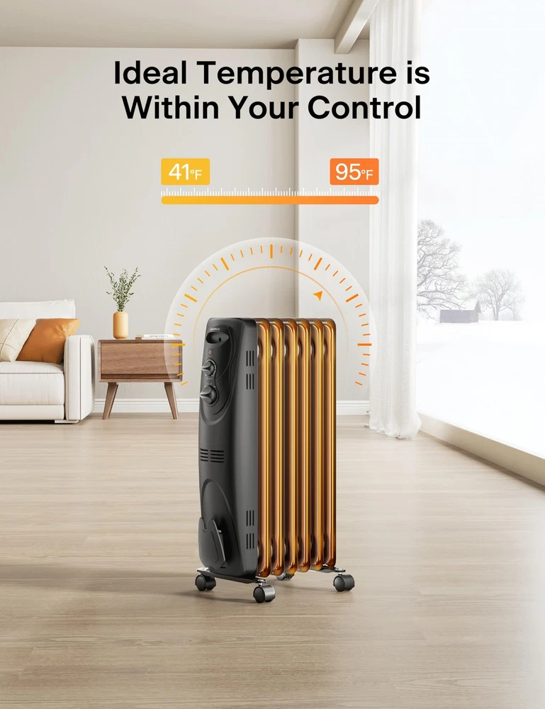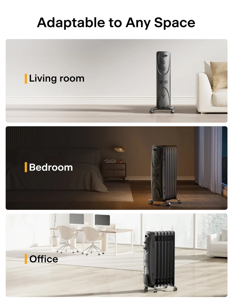 PHO15A2AGW, Basic Oil Filled Radiator, 1500W Portable Full Room Radiant Space Heater with Adjustable Thermostat, black. ππππ π―ππππππ, π³ππππππ πͺππππππ: The 1500W power heats the whole house rapidly and the hot air circulation delivers long-lasting and gentle warmth which avoids dryness in winter, making oil heater your best choice π¬πππππ π¬ππππππππ: Equipped with 3 heating modes 600W/900W/1500W, which can also be used in combination to help save energy bills in winter πΎππππππ-πΈππππ: Lacking of fan construction, oil heater is super quiet, perfect for bedrooms, offices, rooms and other indoor places where not fan of noise πͺππππππππππππ πΊπππππ: Power indicator light lets you know the unit is ON, built-in safety, over-heat protection and tip-over safety switch shuts heater off if accidentally knocked over π·πππππππ π«πππππ: 4 heavy-duty universal casters and the front carrying handle make it easy to satisfy your needs of heating different rooms