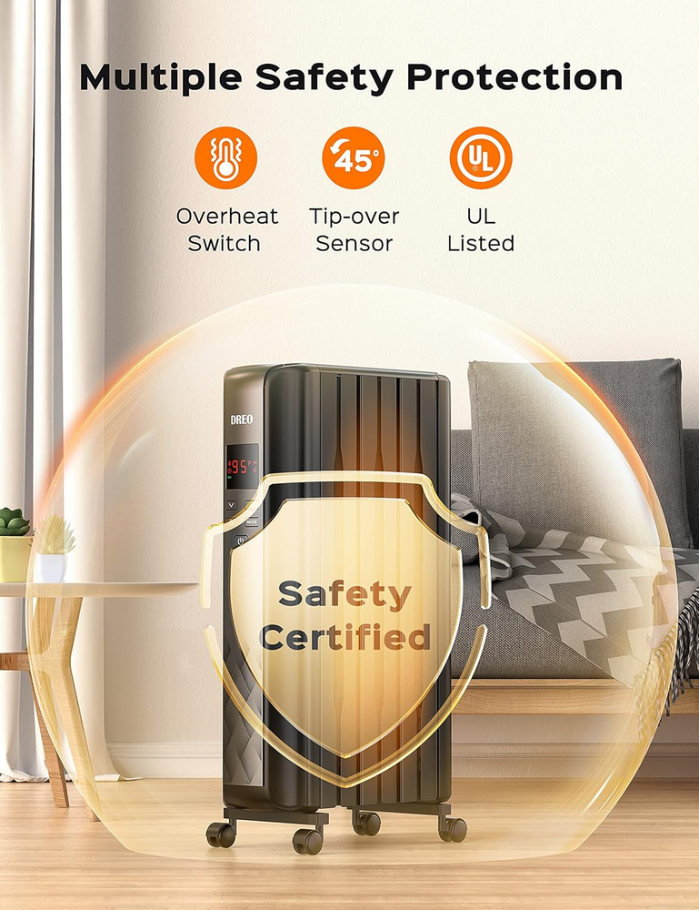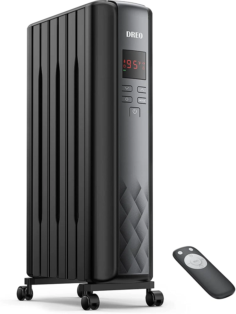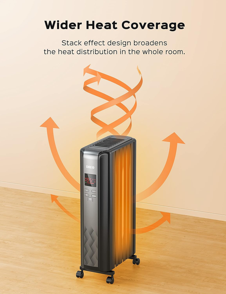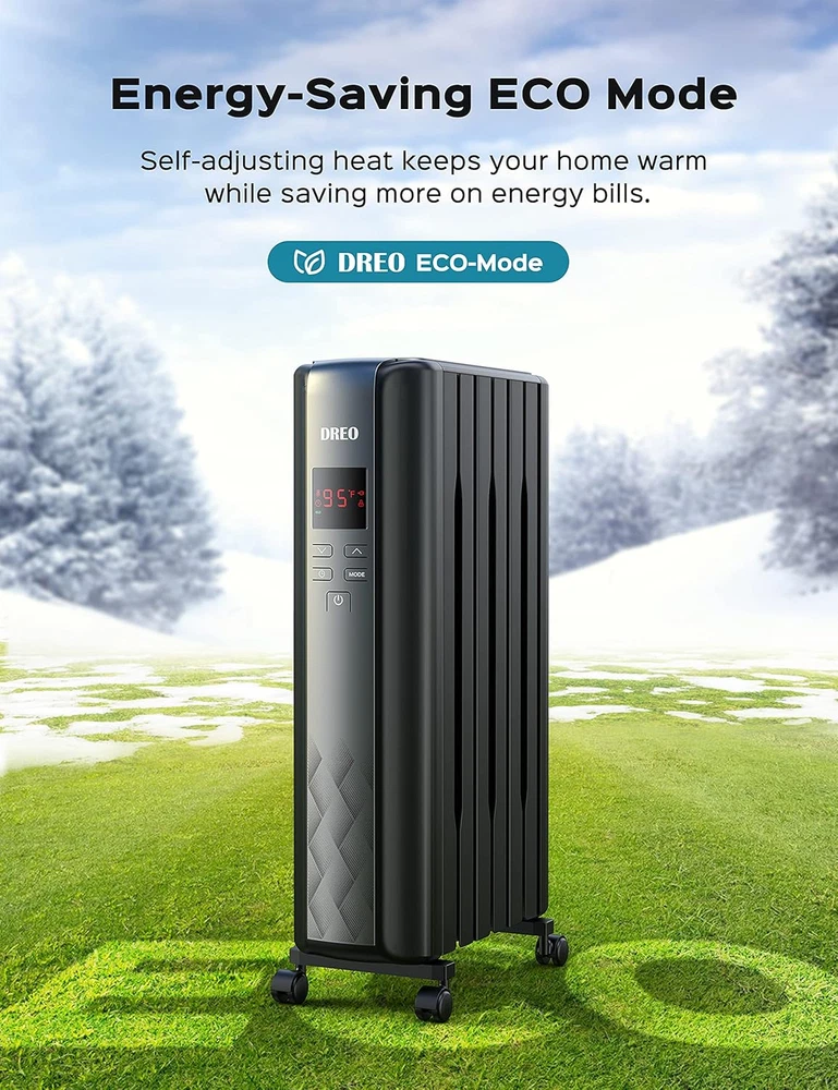 ๐๐๐ง๐ข ๐๐๐๐ฉ๐๐ฃ๐ ๐๐ค๐ง ๐ฌ๐๐ค๐ก๐ ๐ง๐ค๐ค๐ข: 1500W high power, spindle-shaped openings and M-shaped heating fins create stack effect to provide 360ยฐ efficient circulation of hot air in your rooms, keeping your home cozy and warm without drying out the air. Dreo oil radiator heater is your best go-to in winter. ๐๐๐๐ก ๐๐๐๐ฉ ๐๐๐จ๐ฉ๐๐ง: The spindle-shaped openings, 225 mm larger than others enlarged fins and Dual U-shaped heating tubes make the Dreo oil radiator heater so effective in distributing heat that the heat can be doubled and released quickly, evenly and efficiently to a large area or the entire room. ๐พ๐ค๐ค๐ก ๐ฉ๐ค๐ช๐๐ ๐๐๐จ๐๐๐ฃ: With the wraparound heating fins design, the heating element and fins are not directly exposed, preventing burn risks. The exteriors are also specially treated to be only at 80โ at most during use, 30% less hot to the touch than most oil heaters. ๐๐ฃ๐๐๐ฃ๐๐๐ ๐จ๐๐๐๐ฉ๐ฎ: Dreo Oil Filled Radiator Heater made of V0 flame retardant materials was certified by UL. Built-in tip-over switch, Dreo Oil-filled heater will automatically shut off while tip-over by accident to ensure you and your family are safe and worry-free ๐๐ฃ๐๐ง๐๐ฎ ๐๐๐๐๐๐๐๐ฃ๐ฉ: Equipped with 600W/900W/1500W heating modes, this space heater also features a smart ECO mode that adjusts the working mode based on the room temperature with built-in precise temperature sensor, continuously keeping your home in constant warmth while saving more on your energy bills in winter ๐๐๐จ๐ฎ ๐ฉ๐ค ๐ช๐จ๐: A remote is included to allow you to mute, set a timer, and access other functions of this oil-filled radiator heater from 19 feet away. Universal wheels make moving this big guy a breeze. Assembly is super easy โ Just open the bottom brackets and insert the wheels directly. No tools needed ๐๐๐ง๐ข ๐๐๐๐ค๐ง๐ ๐๐ง๐ง๐๐ซ๐๐ฃ๐ ๐๐ค๐ข๐: Dreo oil radiator heater comes with a 24-hour timer, you can set the timer in 1 hour increments. Not only can you set the auto off time, you can also set the auto on time while on standby. Always stay warm when at home Product Description Dreo is a sustainable lifestyle. Our team is committed to helping people enjoy home lives in a fun and sustainable way. Every day we put customers at the core of everything and seek to create value for people's lives by harnessing the latest smart home technologies in the most unexpected ways. At Dreo, we are always in pursuit of something better. Tip Over Switch Overheat Protection Wraparound Protection UL Certification 4 Heating Modes Upgrade Oil filled Radiator Heater Dreo oil-filled radiator heater is the ultimate all-rounder that gives you maximized warmth and comfort when the winter storm strikes. Sleek and modern, this heater uses extended fins and spindle-shaped openings to ensure a wide and even spread of warmth across your home. With a host of settings, this heater optimizes the efficiency to reduce your heating bills on cold days. If youโre looking for a stylish, powerful and energy-efficient heater, Dreo oil-filled heater is your ideal choice. Spindle-Shaped Openings M-shaped Heating Fins 225mm Enlarged Fins Wraparound Heating Fins Design Remote Control ECO Mode 24 Hours Auto On/Off Timer Easy Operation Straightforward LED display and control panel offer a wide range of cutomizations in thermostat (40-95โ), timer (1-24h), heating mode (1500W/900W/600W/ECO), child lock and more. Control from Sofa or Bed Remote control provides 19-feet access to all the functions of your heater. The mute function enables you to turn off the button sound at any time. Just sit back and embrace the warmth. 4 Heating Modes Dreo oil filled radiator heater comes with 3 working modes (Low:600W; Med:900W; High:1500W) and an extra ECO mode to personalize your warmth during chilly days while preventing sky-high energy bills. Moves in All Directions The recess at the oil heater back makes it easier to pull or push. With the universal wheels you can move the dreo oil heater to anywhere you want like garage, basement and so on Tool-Free Assembly The package contains 4 casters that make your heater stand stable and convenient to move around. Just pull apart the bottom brackets, insert the casters, and press them into the holes. No tools needed! Premium Diathermic Oil The internal oil features high purity. It neither ignites at 446ยฐF nor loses its flowability even at -0.4ยฐF. This space heater is completely sealed and the oil never evaporates or disappears. No refill and change needed forever.