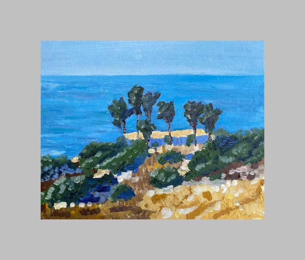 This oil painting captures the scenic beauty of Sunset Cliffs, featuring an idyllic ocean view framed by palm trees and vibrant coastal foliage. The brushstrokes in varying shades of green and blue capture the movement of the waves and the breezy quality of the seaside landscape. The ocean's vivid blue contrasts with the earthy tones of the cliffside, while the bold, impressionist brushwork adds texture and depth, drawing the viewer into the peaceful yet lively atmosphere of the California coast. Art collectors and coastal lovers will find value in this painting, as it offers an impressionist interpretation of an iconic San Diego location. The work embodies both the spirit of Sunset Cliffs and the impressionist style, with its expressive, layered brushstrokes and harmonious color palette. The dynamic composition captures the beauty of nature in a way that goes beyond realism, highlighting the essence of a coastal scene bathed in sunlight and the joy of being near the ocean. This painting would be an eye-catching addition to any art collection, bringing warmth and a hint of California’s coastline to any space. For potential buyers, this artwork is more than a depiction of a place; it’s an invitation to experience the charm of Sunset Cliffs every day. Perfect for anyone who values nature-inspired decor or has a connection to the ocean, this painting brings an element of tranquility and natural beauty into the home.