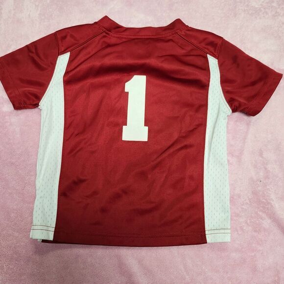 Show your little one's Sooner spirit with this authentic Oklahoma football jersey! Perfect for game days, tailgating, or everyday wear. The vibrant red and white design features the iconic 'Sooners' text and #1, making your child feel like part of the team. Comfortable and durable, it's ideal for active kids who love to cheer on their favorite college squad. Sport: Football Keywords: Oklahoma Sooners, football jersey, youth sports, college apparel, team spirit, athletic wear, toddler size, game day outfit, fan gear, NCAA