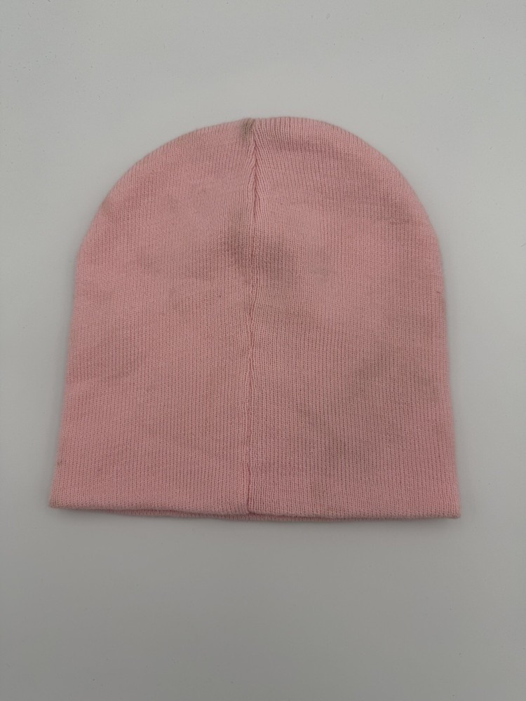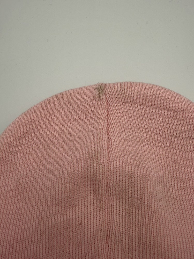 The product is a pink knit winter beanie hat with the logo of the Oklahoma Sooners college football team. It is designed for women and features the team's branding with the NCAA logo. The hat is one size fits all and is suitable for wearing during the regular season to show support for the Oklahoma University Sooners football team. Beanie has some what appears to be dirt. See photos.