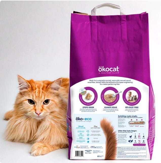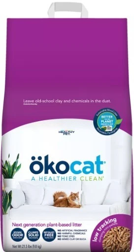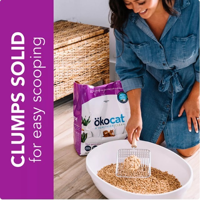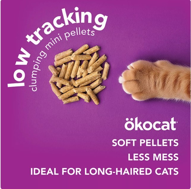 Okocat Less Mess Clumping Wood Cat Litter Low Dust, Low Tracking, Natural, New Select a cat litter designed to be cleaner and more comfortable for your cat while supporting a healthier home environment. okocat Less Mess is produced using compact mini-pellets that feel gentle under paws and are far less likely to scatter outside the litter box or track through your living space compared to finer litter types. This makes it an excellent option for long-haired cats as well. okocat delivers powerful odor control paired with a naturally fresh scent inspired by the outdoors. Made completely from responsibly rescued, sustainably sourced natural wood fiber, this litter avoids traditional clay and chemical additives. Built on advanced European engineering, okocat offers reliable performance with environmental responsibility. The product is now available in 100% recyclable packaging, helping reduce environmental impact inside and outside the home. Features Prevents odor at the source: Natural wood fiber stops enzymes from bonding with liquid and waste, helping block ammonia formation and odors Forms firm clumps for easy cleaning: Precision-cut fibers absorb moisture quickly to create solid clumps that simplify scooping 99% dust free: Screened and de-dusted wood fibers provide a cleaner pour without dirty clay dust Free from artificial additives: No artificial fragrance, synthetic chemicals, toxic dyes, mined clay, or silica Biodegradable and eco-friendly: Made from reclaimed natural wood fiber that can safely return to the earth; packaged in a recyclable paper bag Long-lasting performance: Rapid absorption prevents liquid from reaching the bottom of the box; with regular scooping, litter can last up to 7 weeks Naturally lightweight: Easy to lift, pour, and dispose of Specifications Material: Reclaimed natural wood Environment Type: Indoor use Species: Cat Scented / Unscented: Unscented Clumping Type: Non-clumping Package Dimensions: 12.5 in × 9 in × 20 in Package Weight: 21.5 lb