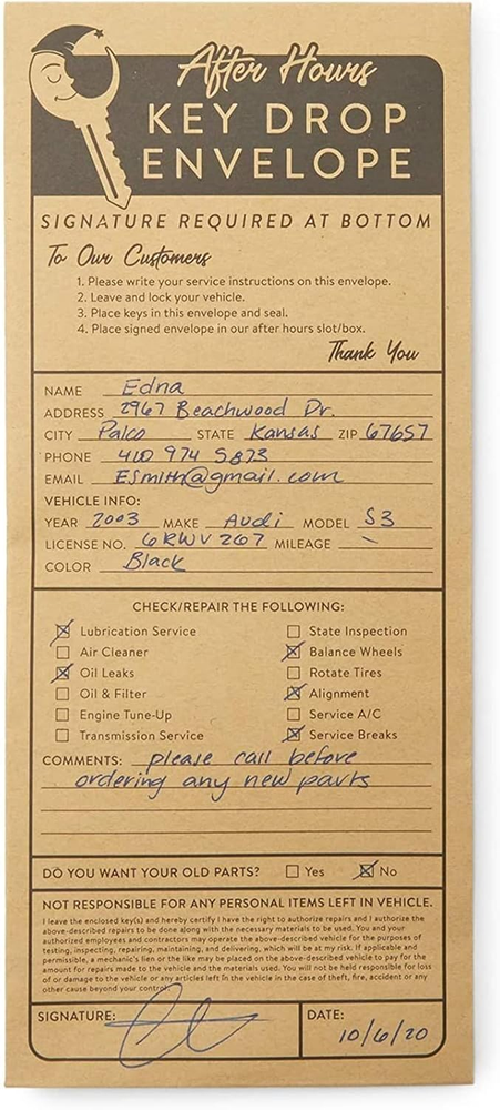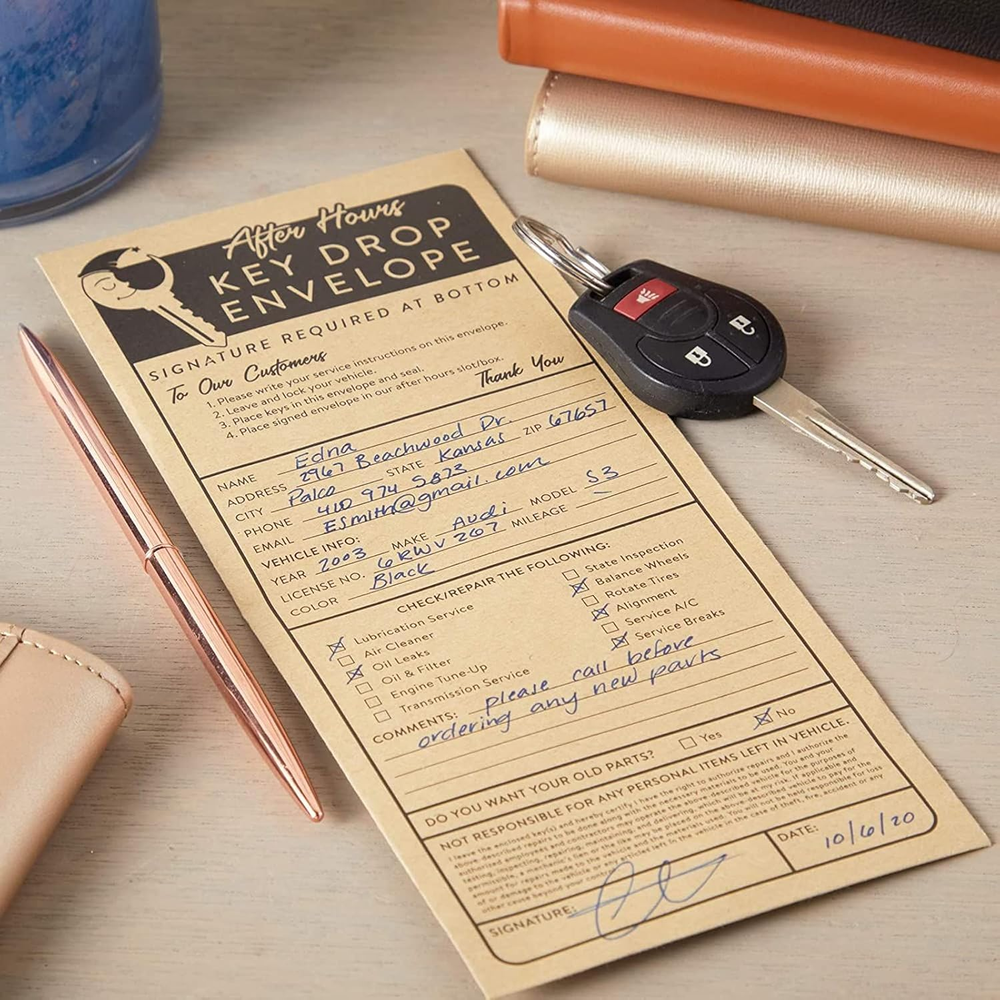 Store New Arrivals Add to Favorite View Feedback Okuna Outpost Key Drop Envelopes for after Hours Box, Car Mechanics (4.12 X 9.5 In, 200 Pack) Description Item model number LJ-ZJMGO-072320-01-1 Closure Self-Seal Number of Items 200 Closure Type Self-Seal Color beige Brand Okuna Outpost Material Cardboard Material Type Cardboard Manufacturer Part Number ZJMGO Item Weight 3.36 pounds Shape Rectangular Manufacturer Juvo Plus Product Dimensions 9.5 x 4.12 x 0.04 inches Size 9.5 inches Key Drop Envelopes: Use this set of after-hours overnight key envelopes to ensure your guests can safely and securely drop off their auto keys Auto Mechanic Supplies: These car key drop off envelopes feature convenient service prompts such as oil leak, alignment, and tune up boxes as well as client contact information fields High Quality: Each drop off box envelope is made of durable kraft paper with peel and stick adhesive closure Dimensions: Each car key envelope measures 4.12 x 9.5 inches, suitable for standard size keys What's Included: This auto mechanic key drop off set comes with 200 peel and seal key envelopes After Hour Key Drop Envelopes (4.12 x 9.5 In,200 Pack) Key Drop Envelopes: Use this set of after-hours overnight key envelopes to ensure your guests can safely and securely drop off their auto keys Auto Mechanic Supplies: These car key drop off envelopes feature convenient service prompts such as oil leak, alignment, and tune up boxes as well as client contact information fields High Quality: Each drop off box envelope is made of durable kraft paper with peel and stick adhesive closure Dimensions: Each car key envelope measures 4.12 x 9.5 inches, suitable for standard size keys What's Included: This auto mechanic key drop off set comes with 200 peel and seal key envelopes ASIN: B08DKGDNYM Use this set of after-hours overnight key envelopes to ensure your guests can safely and securely drop off their car keys. Ideal for mechanic shops, these key drop envelopes have a peel and stick adhesive closure for added security. Each key drop box automotive envelope features convenient service prompts as well as client contact information fields, keep your office organized and informed with these key drop service envelopes. You will receive 200 per pack. ABOUT US We offer the best prices around on high quality products. Our E-store includes media such as books, movies, music and games while offering electronics, toys, sporting apparel, clothing, tools, general home, garden items and more. SHIPPING We are always working hard to ensure your package arrives as soon as possible. Please understand that some factors like weather, high postal traffic, and the performance of shipping companies are outside of our control. We offer free shipping to the lower 48 states and ship within 2 business days of payment, usually sooner. We do not accept P.O. Boxes. Please provide a physical address. RETURNS We offer a 30-Day Return Policy on items which you are not completely satisfied with. You have the option for a full-refund or an exchange of the item. No returns are available on items shipped outside of the USA. PAYMENT We accept PayPal. CONTACT US This page content is yet to come Please ad us to your favorite seller and visit again later Thank You