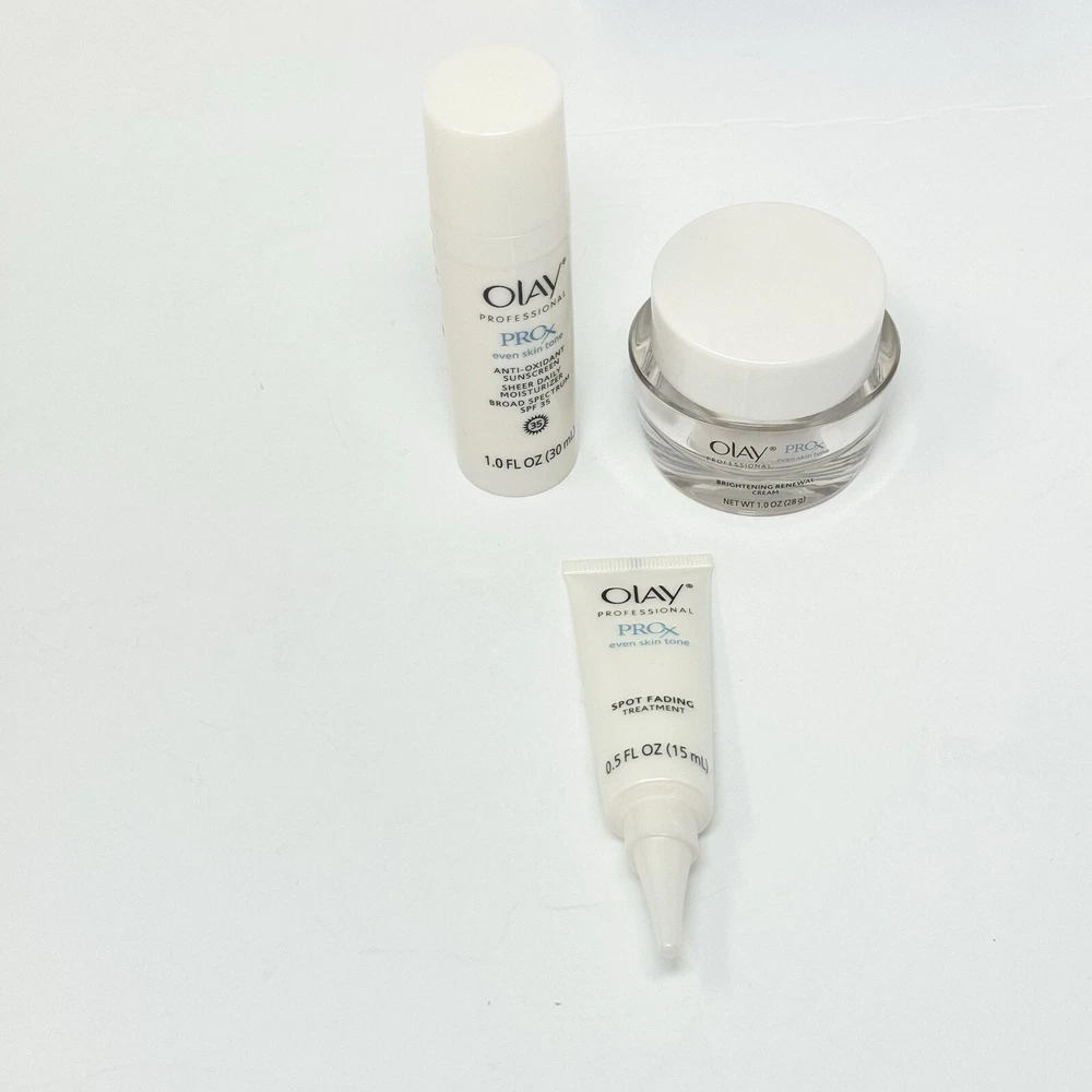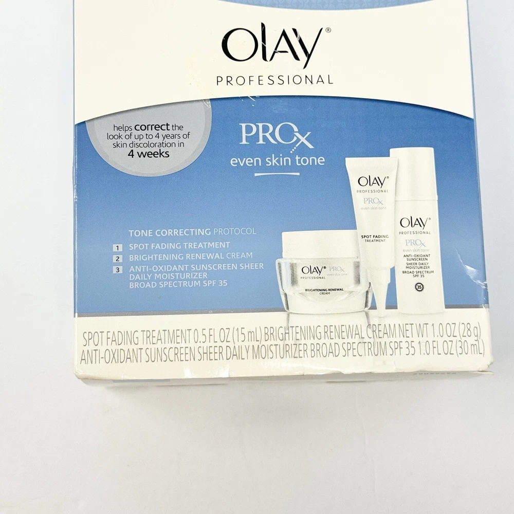 Olay Pro X Even Skin Tone Kit. Box is open, but items are unused. 3 items included in the set: Spot fading treatment .5oz Brightening renewal cream 1oz Sheer daily moisturizer with spf 1oz Discontinued products so the spf has a expiration date of 07/2015