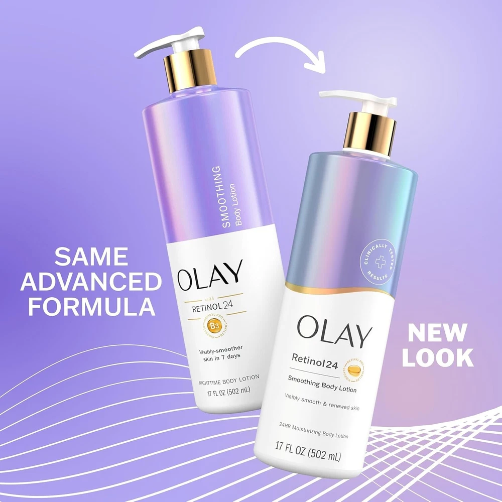 Product Description Transform your skincare routine with the Olay Smoothing Body Lotion, specially formulated to provide 24-hour moisturizing benefits. This luxurious body lotion features retinol, known for its skin-smoothing properties, along with Vitamin E and Vitamin B3 complex, working together to nourish and enhance your skin's texture. Our formula is aimed to give you visibly-smoother skin in 7 days. The fast-absorbing formula of this body lotion ensures that your skin feels soft and hydrated without any greasy residue, making it perfect for daily use. Ideal for all skin types, the Olay Smoothing Body Lotion penetrates skin up to 10 layers deep and leaves your skin with long-lasting smoothness and increased cell turnover. Experience the powerful benefits of this body lotion and embrace beautifully cared-for skin. Use with Olay Skin Care-Inspired Body Wash to boost effects of Vitamin B3 Complex and moisturizing ingredients.