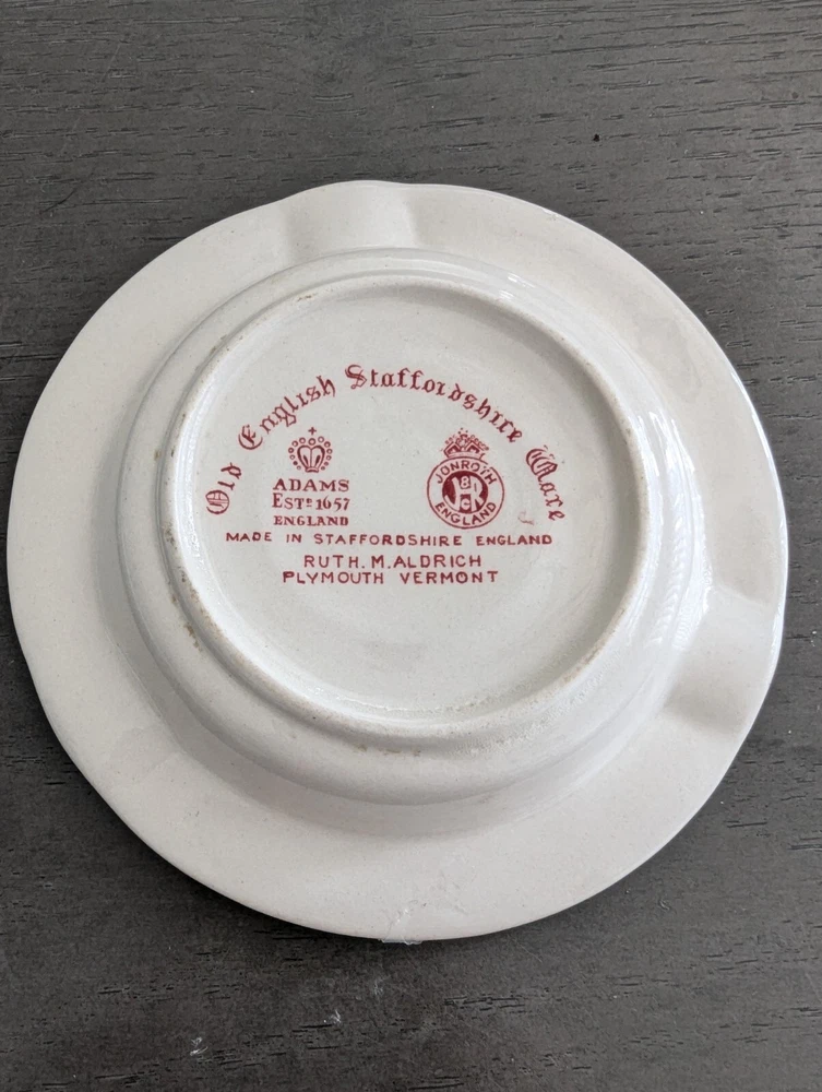 This vintage ashtray is a beautiful addition to any collection. Made by Old English Staffordshire, this piece features a stunning red color and is crafted from high-quality bone china. Measuring 5 inches in diameter, it is the perfect size for use or display. The design is adorned with the Staffordshire brand, adding to its value and authenticity. This ashtray is a must-have for any lover of pottery and glassware, and is sure to be a conversation piece.