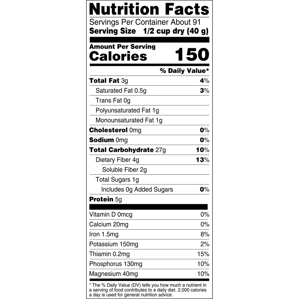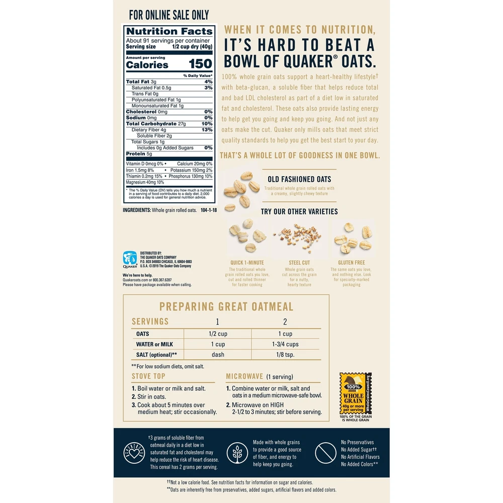 Old Fashioned Rolled Oats - Non GMO, Heart Healthy, High Fiber - 2x64oz Bags, 90 About this item Nutrition information Product details Want a great start to the morning? Help yourself to a bowlful of tasty Quaker Old Fashioned Oats. These sodium-free whole grains break down slowly to provide energy that lasts. And as part of a diet low in saturated fat and cholesterol, their soluble fiber may help reduce the risk of heart disease - providing two grams of the three grams of fiber needed. Try them with fruit and nuts for a hearty crunch, or with honey, cinnamon, or brown sugar for a warming sweet flavor. And Quaker Old Fashioned Oats aren't just for breakfast. Shelf-Stable. Includes a 128oz Box containing 2 (64oz) bags of Quaker 100% Whole Grain Old Fashioned Rolled Oats These Quaker Oats are Non-GMO Project Verified. Look for specially marked packages with the Non-GMO Project Verified Symbol Heart Healthy Whole Grains - Quaker Oats are 100% Whole Grains. Diets rich in whole grain foods and other plant foods and low in saturated fat & cholesterol may help reduce the risk of heart disease. Good Source of Fiber - Quaker Oats provide a good source of fiber to support a healthy digestive system. See nutrition facts for total fat per serving. Made with 100% Whole Grains Ready-To-Cook: Try topping with fresh or dried fruits, nuts or cinnamon, or make breakfast while you sleep with a delicious Quaker overnight oats recipe Our boxes are recyclable! Bags can be recycled through Walmart's takeback program.