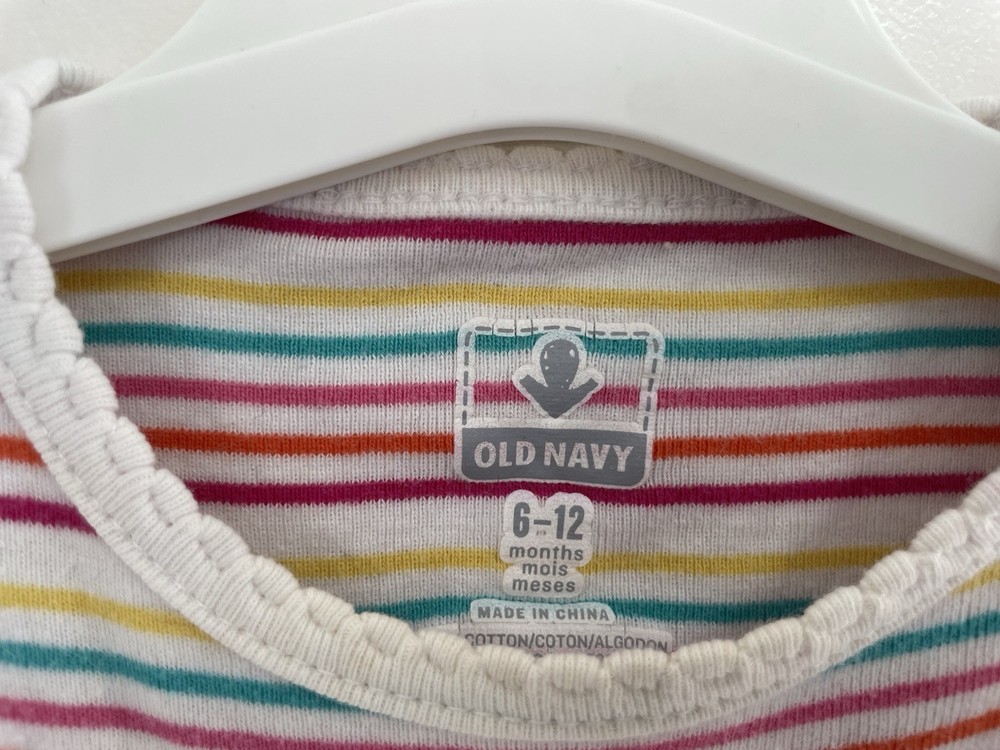 Pattern: Striped Sleeve Length: Long Sleeve Size: 6-12 Months Country of Origin: China Neckline: Crew Neck Set Includes: Bodysuit Brand: Old Navy Color: Cream Closure: Snap Features: Comfort, Easy Care, Lightweight, Stretch Garment Care: Machine Washable Seller Notes: “In good condition. There is a light stain on the front. Free of rips.” Number of Pieces: 1 Piece Season: Fall, Spring, Winter Material: 100% Cotton Occasion: Casual Style: Bodysuit Type: One-Piece Department: Girls