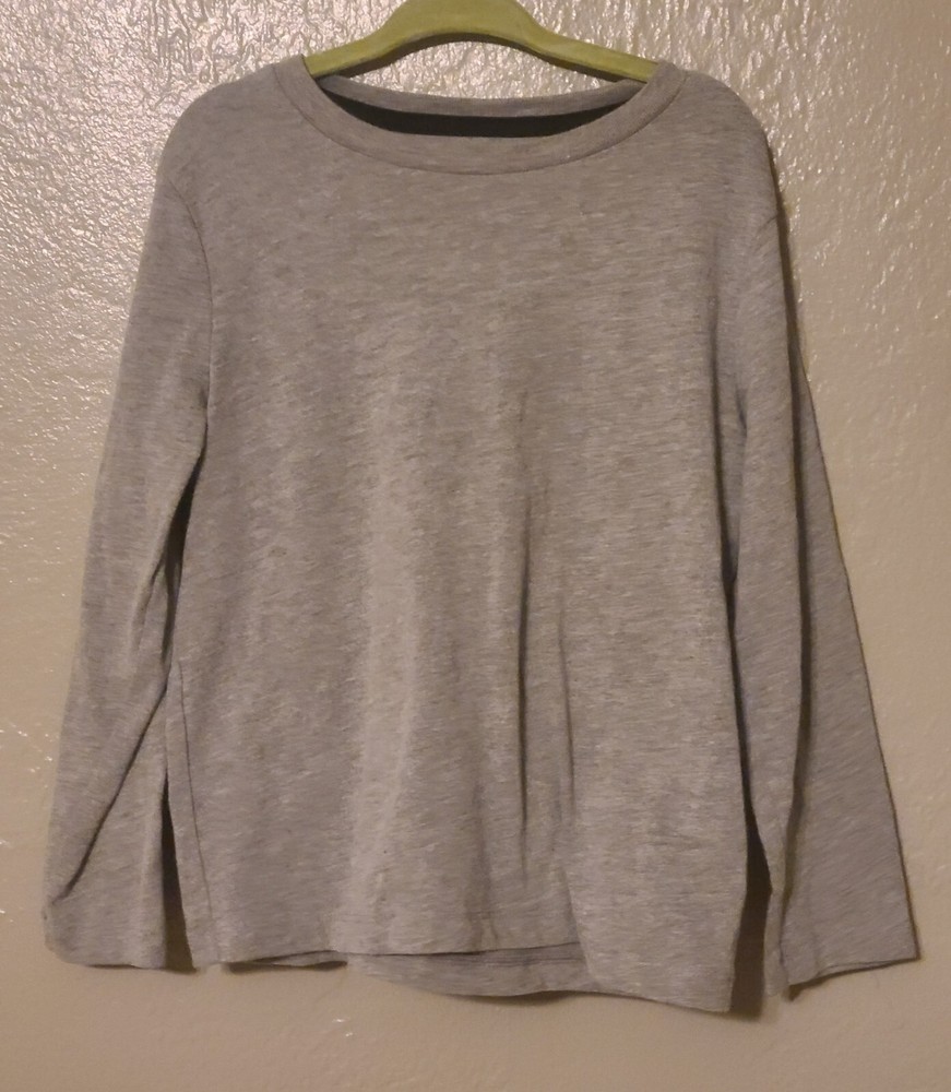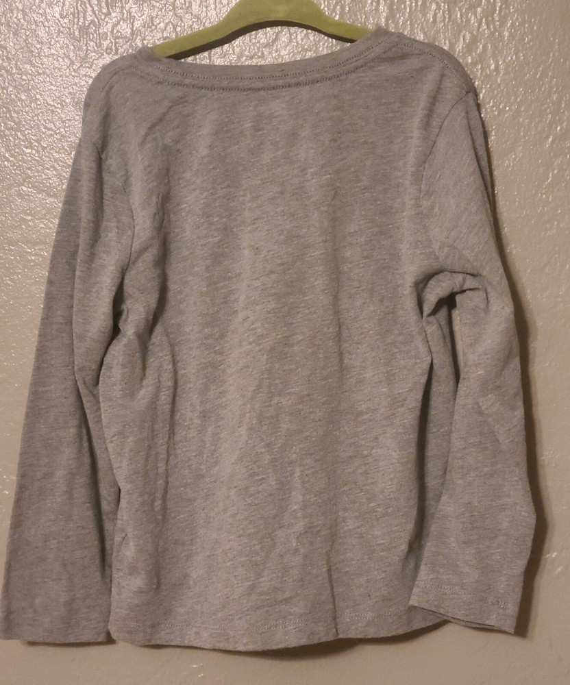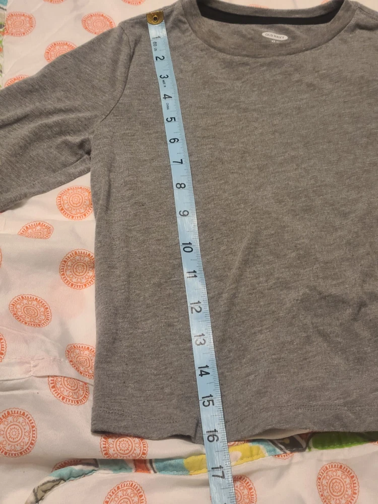 Upgrade your little one's wardrobe with this stylish Old Navy boys' t-shirt. Made from a comfortable blend of polyester and cotton, this pullover features a round neckline and long sleeves. The solid gray color and band collar style add a touch of sophistication to any outfit, making it perfect for activewear, school, or walking. This lightweight and easy-care t-shirt is machine washable and features a dark fabric wash. It's a perfect choice for the winter, fall, or spring seasons. Whether you're looking for a casual outfit for your little boy or something more stylish, this Old Navy t-shirt is a great addition to any wardrobe. See photos for measurements approximate. 60% cotton and 40% polyester. Very good pre-owned condition.