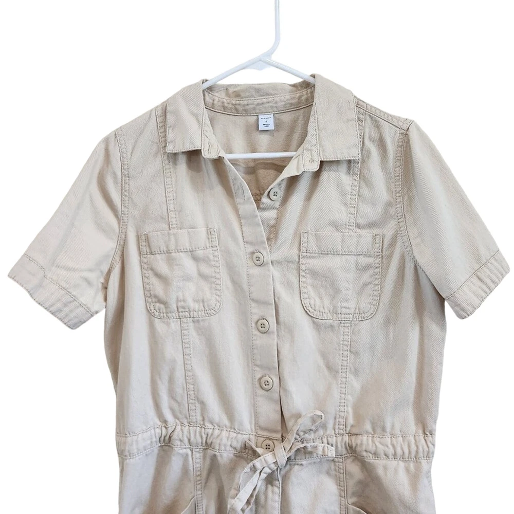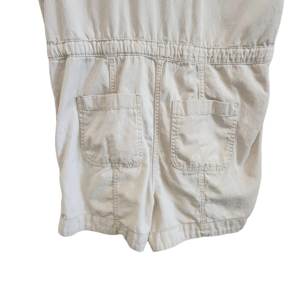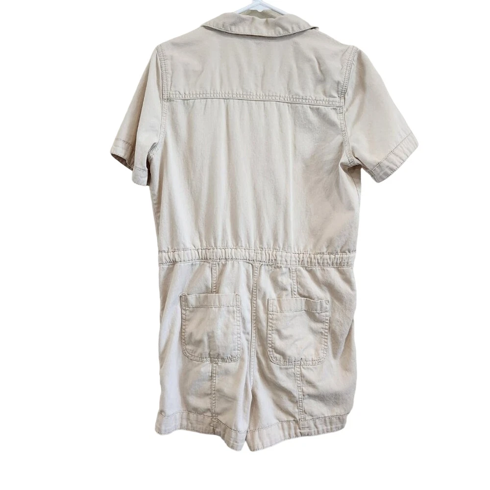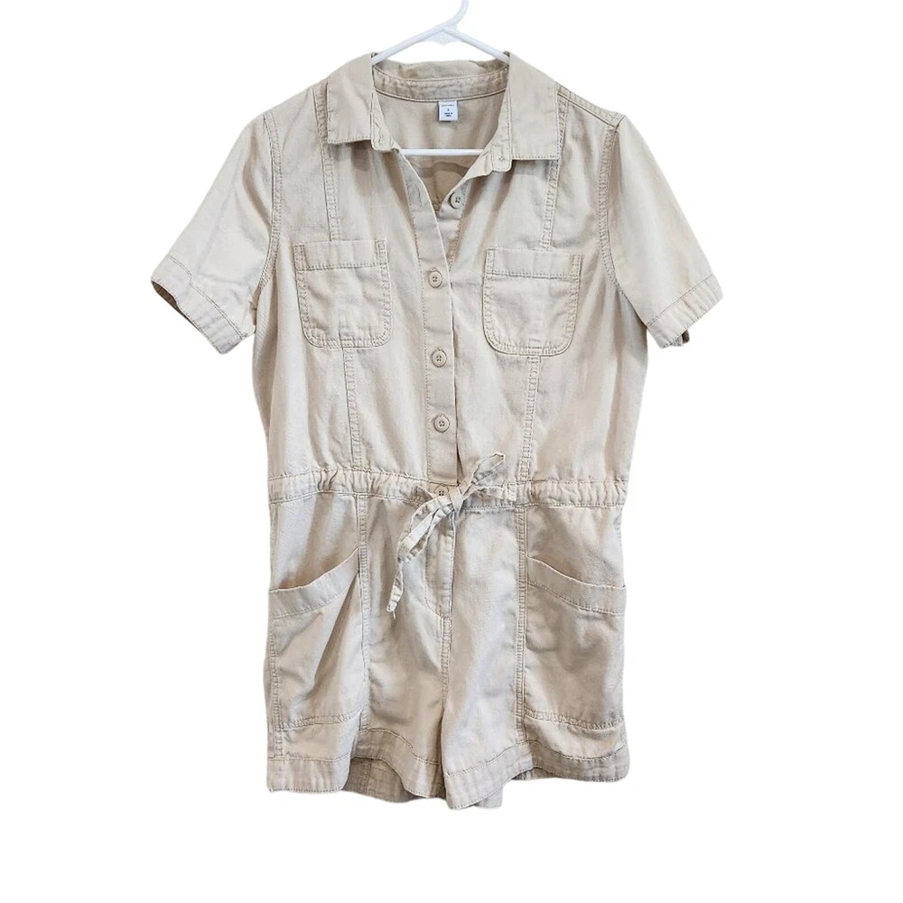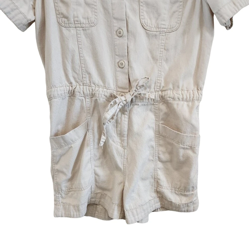 Old Navy Cotton Short Sleeves Button Front Waist-Defined Utility Romper in Ecru Tan Size Small 100% cotton, spread collar, button front, utility patch pockets at the chest, adjustable drawstring waist, hidden zip fly, hip pockets, back patch pockets great condition Measurements: 20 inches armpit to armpit, 31.5 inches shoulder to hem, and 3.5 inch inseam tags: athleisure tennis prep gorpcore clean girl old money quiet luxury safari romper onesie jumpsuit jumper y2k 90's minimalist minimal festival western tomato girl model off duty beachy beach coastal vacation travel sportswear sporty retro girly cute going out
