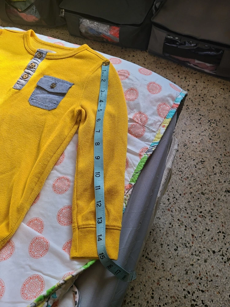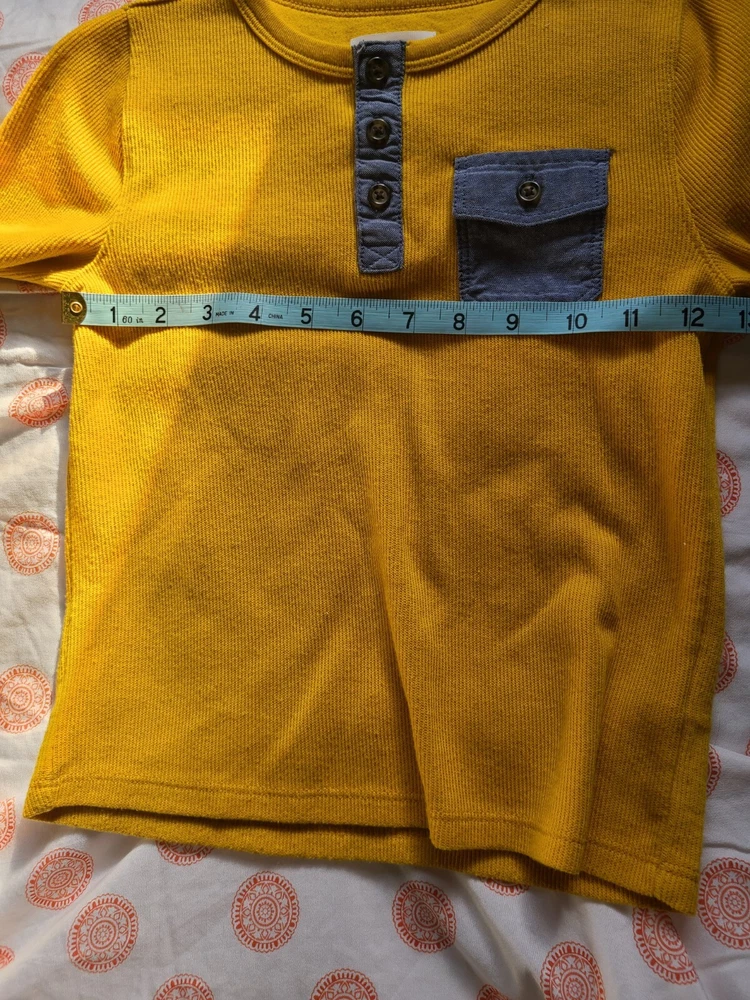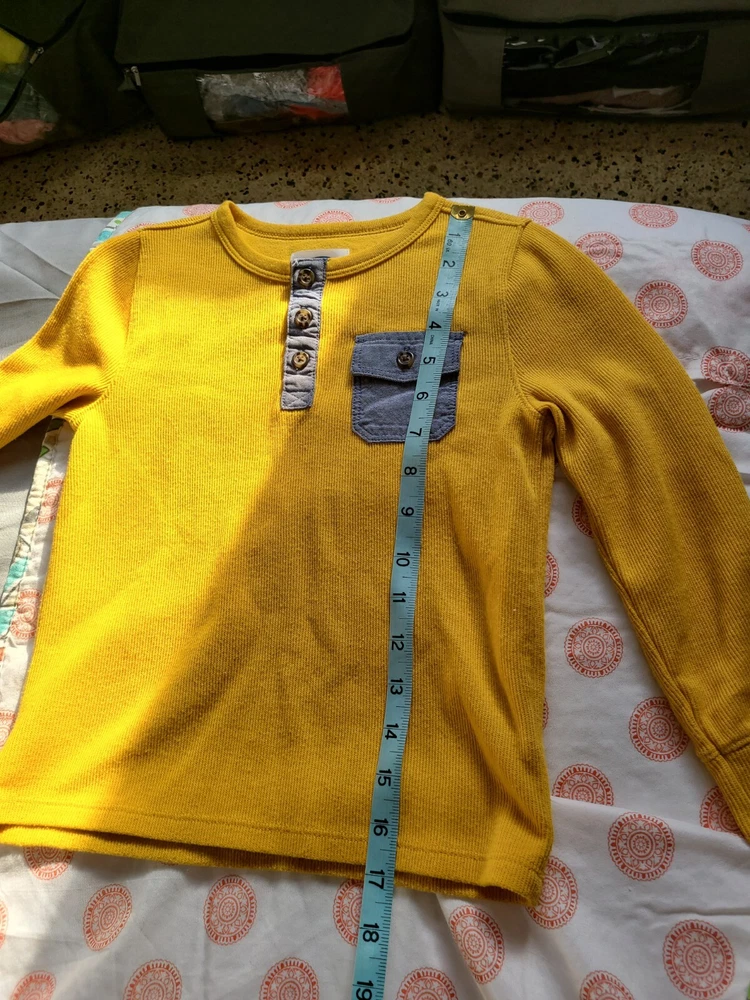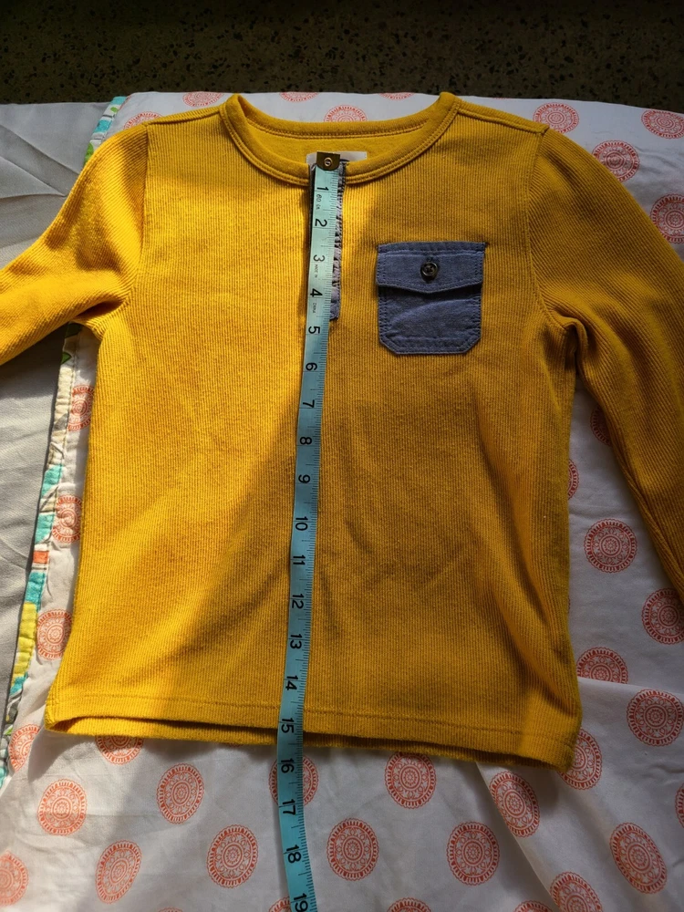 This Old Navy pullover henley shirt in size 5T is perfect for any young boy's wardrobe. The gold waffle knit design adds a touch of style to any outfit, and the long sleeves make it suitable for cooler weather. The shirt features a round neckline and button accents, giving it a classic look. The shirt is made from a blended fabric of polyester and cotton, making it easy to care for and machine washable. It is suitable for various occasions, including travel, activewear, and casual wear. Additionally, the shirt has a solid pattern and is not vintage or handmade. The shirt is an excellent addition to any young boy's wardrobe and is sure to become a favorite. See photos for measurements. Very good pre-owned condition. Medium to lightweight thermal long sleeve shirt. 60% cotton and 40% polyester.