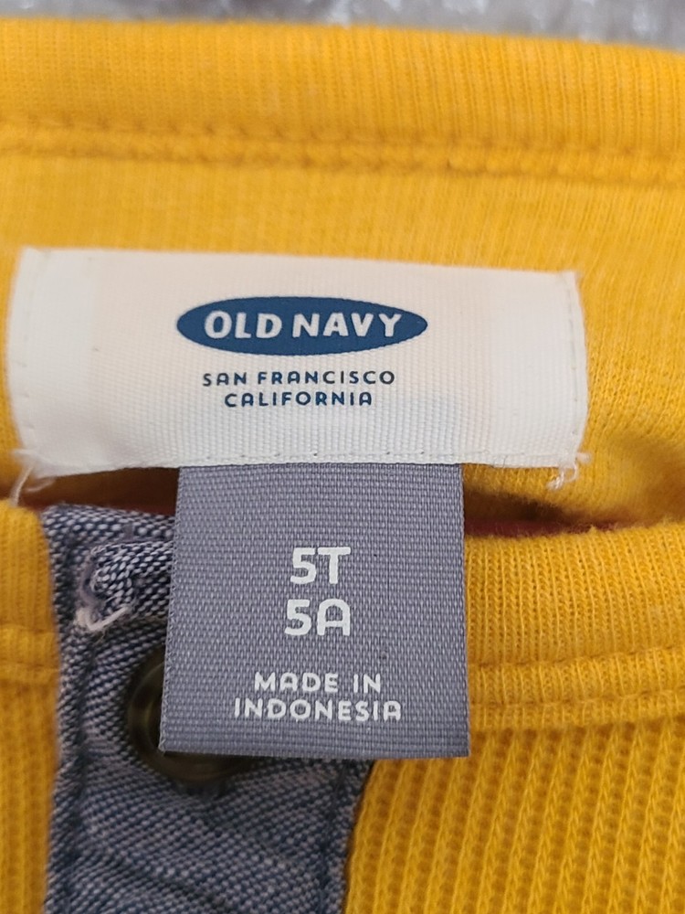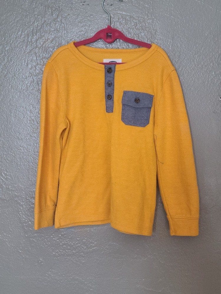 Vintage: No Sleeve Length: Long Sleeve Accents: Button Theme: Metal Department: Boys Material: Cotton, Polyester Performance/Activity: Baseball, Running & Jogging, School Type: T-Shirt Brand: Old Navy Country of Origin: Indonesia Pattern: Solid Character Family: Boys Neckline: Round Neck Color: Gold Handmade: No Garment Care: Machine Washable Closure: Pullover Fabric Type: Blended Fabric Character: boys Features: Easy Care Style: Pullover Personalize: No Occasion: Activewear, Casual, Travel Fit: Regular Size: 5T Season: Fall, Spring, Winter