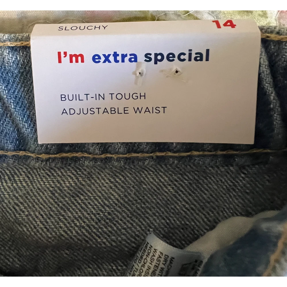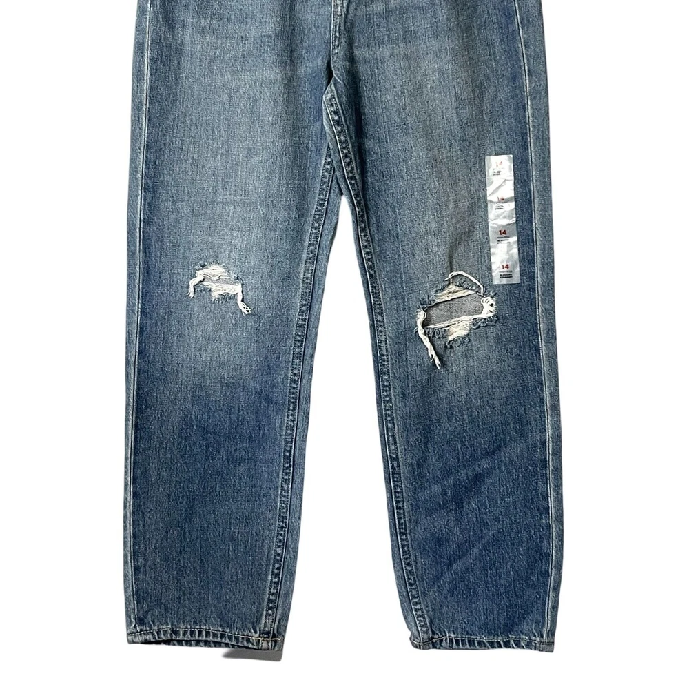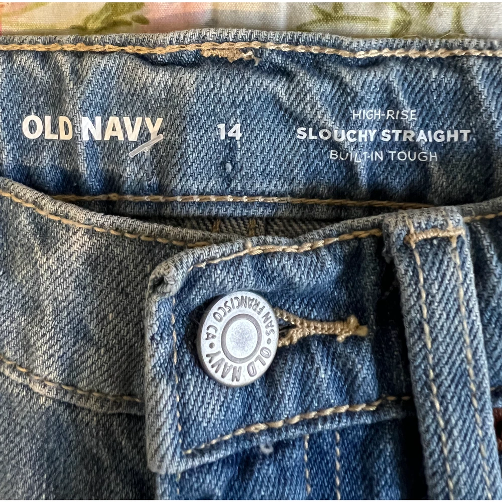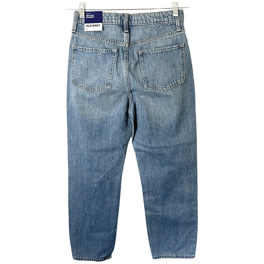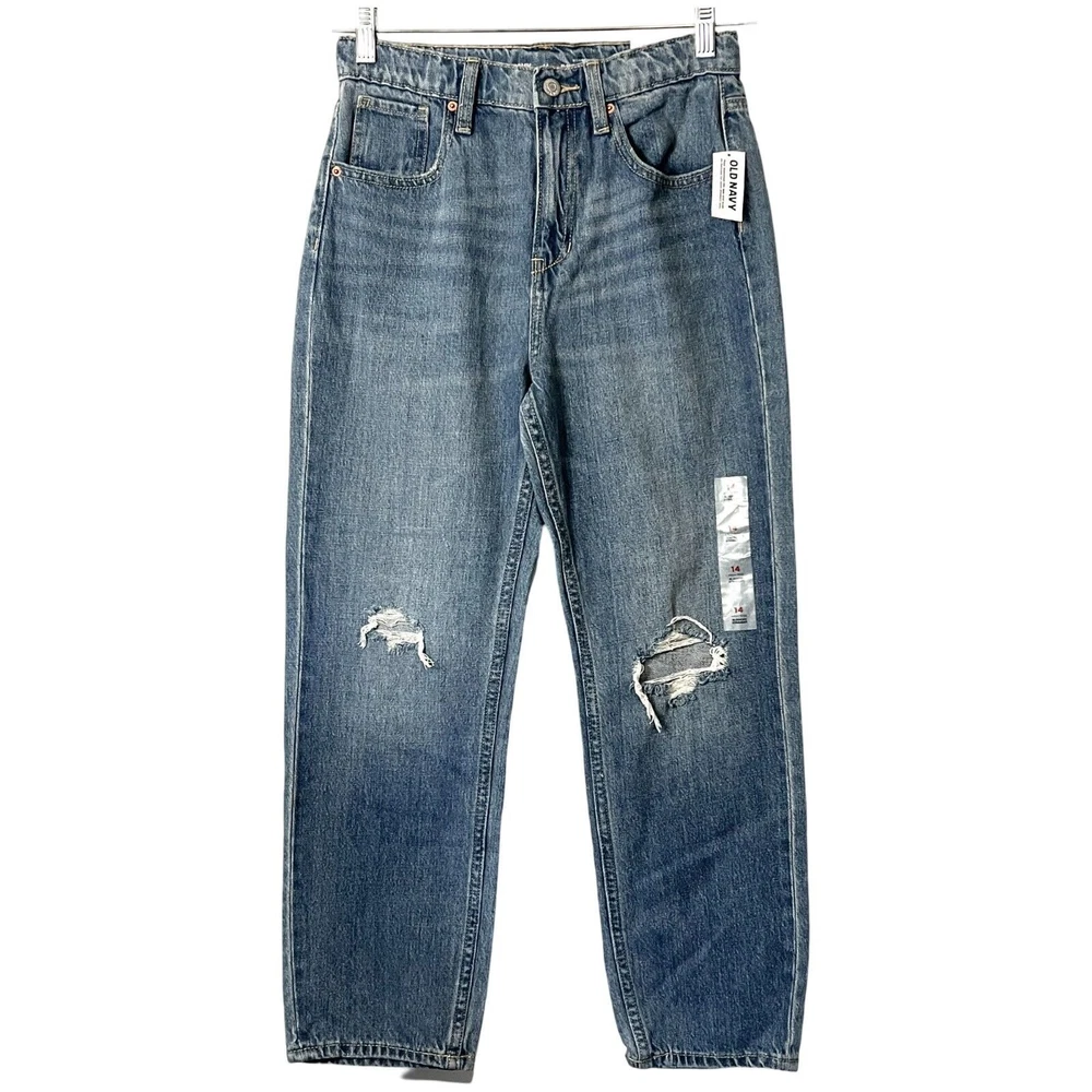 NEW WITH TAGS 27" waist 25" inseam 11" rise Old Navy Slouchy Straight jeans, girls size 14 * high-rise fit * straight leg design * medium wash denim * distressed details * adjustable waist * zip and button closure * pockets * machine washable