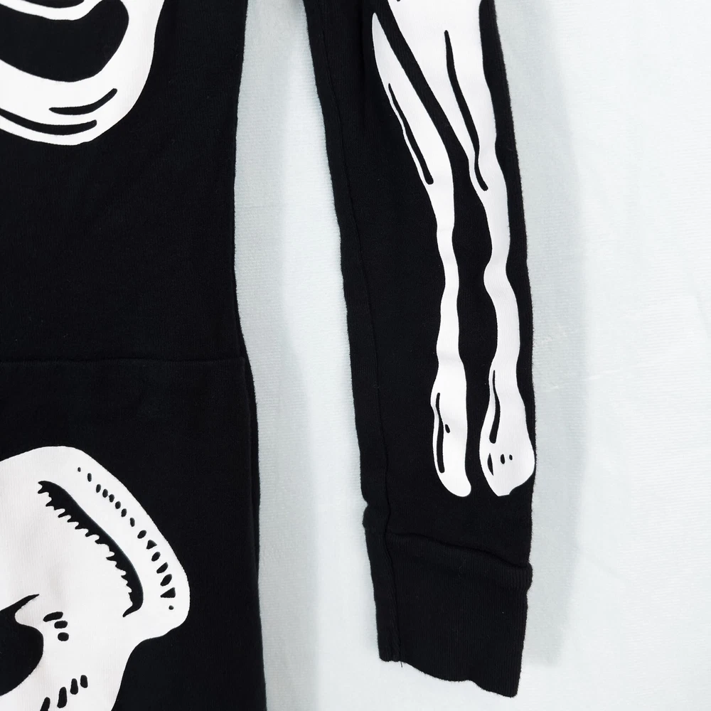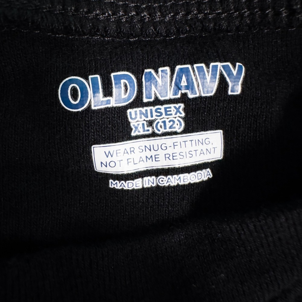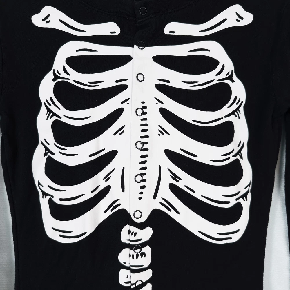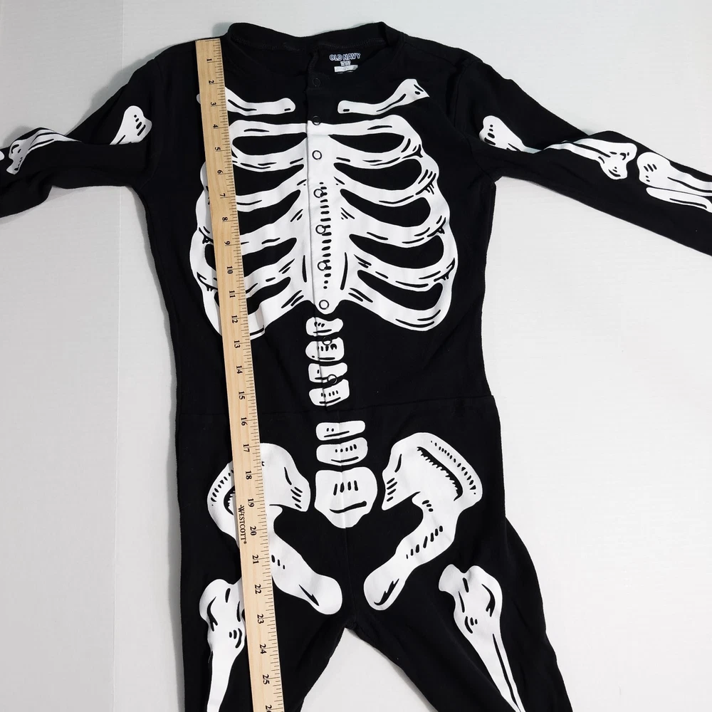 Old Navy Kids Unisex Skeleton One Piece Halloween Costume Pajamas * Condition: Great pre-owned condition. It is missing the care/material tag but has no stains, holes, or major signs of wear. Please see photos. * Size: Unisex XL (12) * Please see photos for multiple measurements * Color: Black, White * Snug-fitting * Human skeleton print on the front and solid black on the back * Pull-on style with snap button closure on front torso * I don't think this one glows in the dark All of my items are stored in a smoke-free, dog-friendly home.