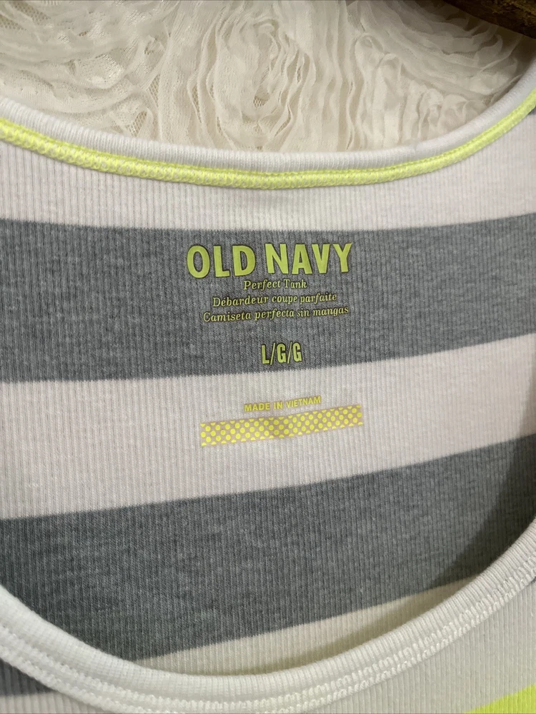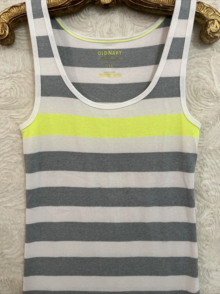 Item Details: Old Navy Tank Top Cotton Blend Stretchy/Contoured Fit Color: White, Gray, Neon Green Size: Large (to ensure fit, please refer to measurements) Shoulder: Chest: Stretches Sleeve/shoulder seam to sleeve edge: Waist: Stretches Hip: Shoulder to Hem: 28.5" Condition: Excellent Condition; No Flaws to Note Condition Rating: 2 Condition Rankings: NWT = Brand New, tags still attached, never used. Mint Condition = Item may have been used, but shows no signs of wear. Excellent Condition: Used, but with minimal signs of wear. Very Good Condition: Used and shows moderate signs of wear, may need repairs, and is sold As Is. Fair Condition: Item is showing significant signs of wear, may need repairs, and is sold As Is. PLEASE NOTE: Most of our items are Pre-Owned or Vintage. Unless otherwise noted, items will not be in new condition. Prior to listing, we carefully inspect each item for flaws, as needed, we will note flaws and include a photo of of flaws. Unless otherwise noted, grossly misrepresented, or incorrect item is sent, buyers agree to buy items AS IS. We do not accept returns. Condition Ratings: 1 = New/Unused Condition; 2 = Pre-Loved/No Flaws to Note; 3 = Pre-Loved/Mild Signs of Wear; 4 = Pre-Loved/Needs Repairs or Shows Significant Wear/Flaws *Measurements are in Inches