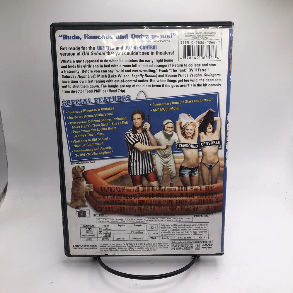 Country/Region of Manufacture: United States Genre: Comedy Language: English gtin13: 0678149062526 Region Code: DVD: 1 (US, Canada...) Release Year: 2003 Movie/TV Title: Old School Edition: Full Frame; Unrated Version Seller Notes: “Please see photos. All USED Movies will have some minor scratches and blemishes on cases.” Director: Todd Phillips UPC: 0678149062526 Format: DVD Case Type: Tall/DVD Case Type: Movie Actor: Vince Vaughn, Luke Wilson, Will Ferrell