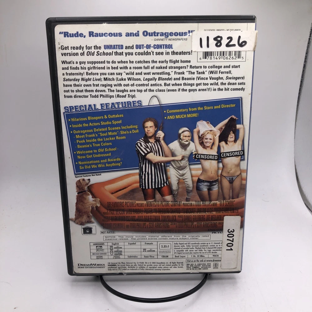 UPC: 0678149062625 Language: English Country/Region of Manufacture: United States Format: DVD gtin13: 0678149062625 Case Type: Tall/DVD Case Edition: Widescreen; Unrated Version Region Code: DVD: 1 (US, Canada...) Type: Movie Release Year: 2003 Features: Widescreen Genre: Comedy Director: Todd Phillips Seller Notes: “Please see photos. All USED Movies will have some minor scratches and blemishes on cases.” Movie/TV Title: Old School Actor: Vince Vaughn, Luke Wilson, Will Ferrell