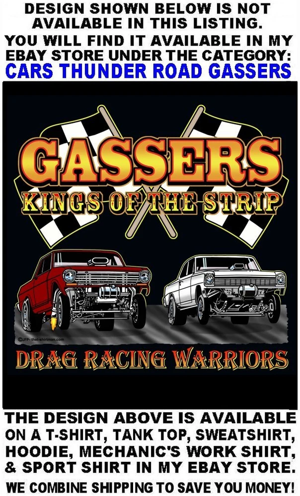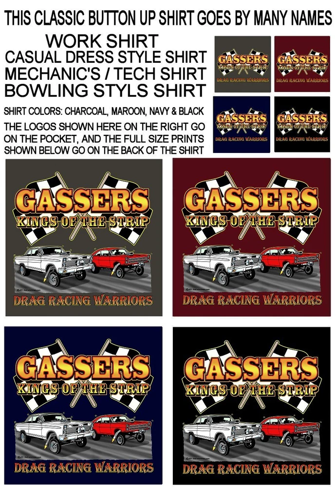 We only use name brand, high quality, soft hand 65% / 35% poly cotton blend poplin permanent press shirts. Great for casual dress, or as mechanic's work shirts. Or better yet, you'll be the hit at any car show, swap meet, or racetrack with one of our specialty custom shirts! These designs are our own copyrighted designs and not available anywhere else. Please use the size chart that is shown in the Ebay pictures for this listing. Colors include Charcoal, Black, Navy, and Maroon in most sizes from Small to 6XL Our shirts are not pre-printed then simply pulled off a shelf. Each shirt is custom printed per your order, by us, right here in the USA. We print and ship within 1 working day. The design for this listing offers 30 different variations. It is a unique shirt you the customer design yourself by choosing this style, the size, and the color. Double check to be sure and order the exact size, color, and print combination you want. IMPORTANT: use the size chart. Buying more than one shirt? I will combine the shipping to save you money. Be sure to click the "Save this seller" button. For more cool short & long sleeve t-shirts, tank tops, sweatshirts, hoodies, zip hoodies, casual mechanics work shirts and more, click on: "Sellers other items". Then click the "category button" to choose the type of designs you like on the style shirt you want. If you have any questions, feel free to ask.