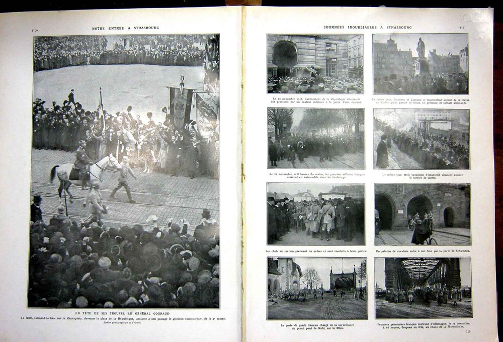 Old Original Antique Victorian Print French Army Strasburg Gouraud Troops Victory Ww1 1927 2 Double Pages As Shown From L?Album De La Guerre, Historic Photographs And Documents Selected From L?Illustration 1914-1919. Printed In Paris By L?Illustration Rue Saint Georges 1927. Size Is Approx (including margins as shown). 15 X 11.5 Inches [390X295Mm]. Great Source Of Quality Ww1 . All prints are original antique prints and are not copies. Many are unique and rare. All products are delivered securely in a re-inforced hard back envelope or a postal tube.