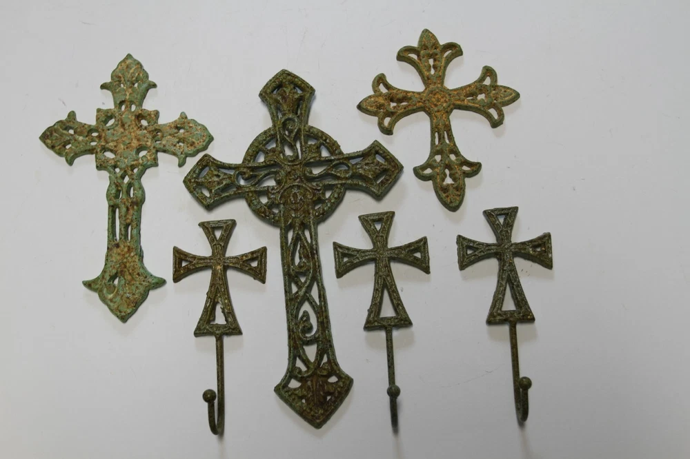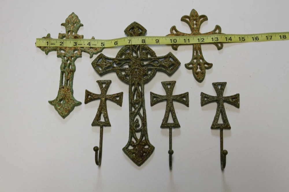 Beautiful cast iron wall crosses for a stunning display. C- 50 51 68 H-67b. Generous hooks on the wall hooks to hang coats, bags, caps, keys... Hang as a group or separately throughout your home. These are great to add to your collection or as gifts for friends. We do not substitute any crosses in this collection. None of them are available for sale individually. This set is a value price. The size range is approximately 5 3/4 inch to 10 3/8 inch. There are holes or brackets on each wall cross for mounting. The holes will vary in placement as these are hand-cast. No hardware provided. You can use any type of standard screw. The front of the crosses are three-dimensional and the backs are flat for flush mounting. The finish is a baked-on powder coat that inhibits rust. Please let us know if this is a gift. We are more than happy to include a hand-written gift message on your behalf. If for any reason the order is returned, all items must be returned to receive a refund. Our cast iron products are made in China, housed and shipped by Texans in USA C- 50 51 68 H-67b